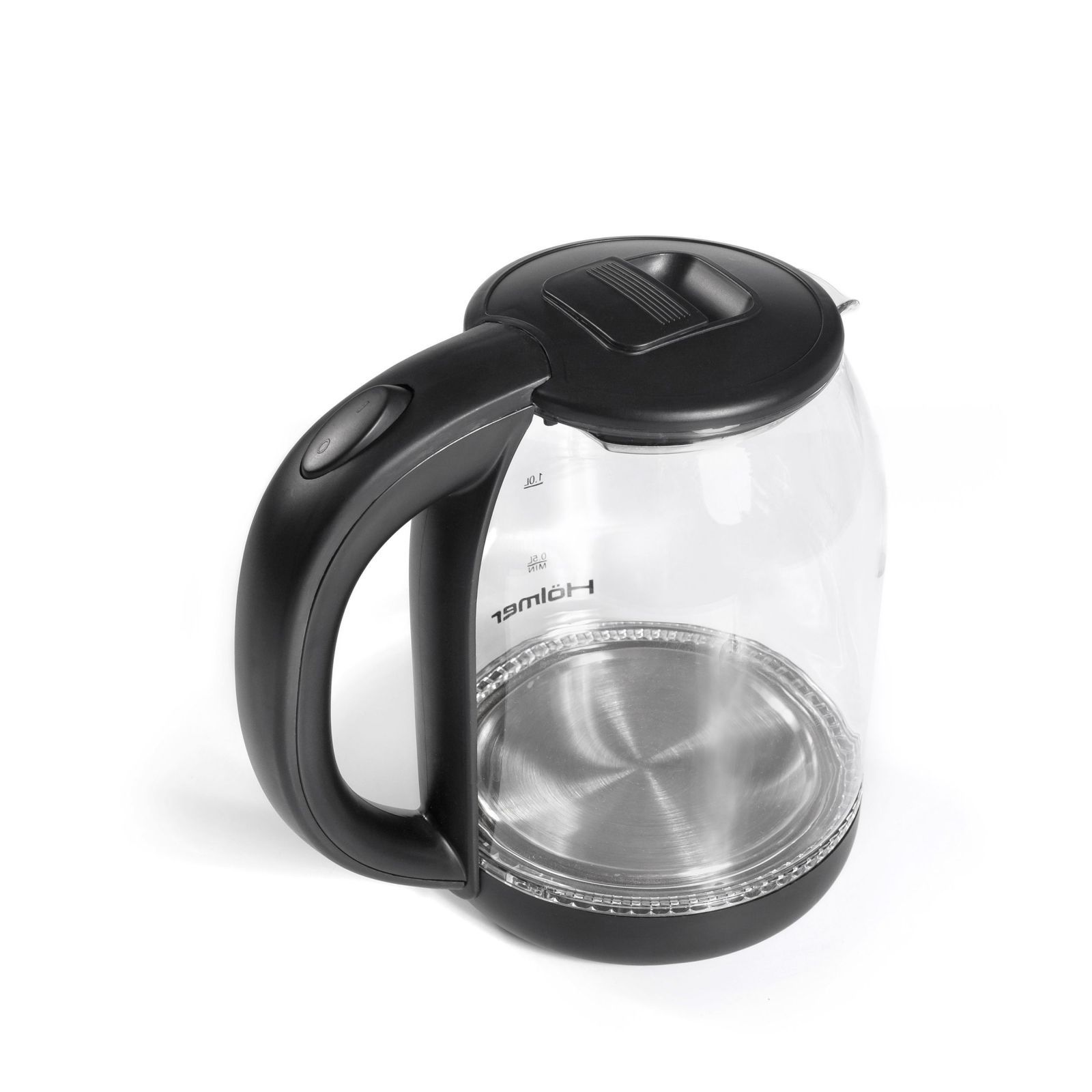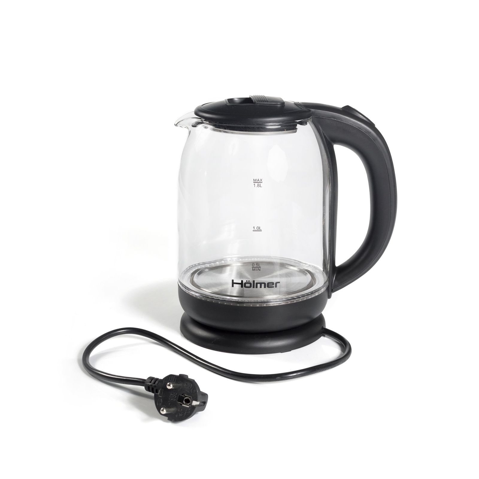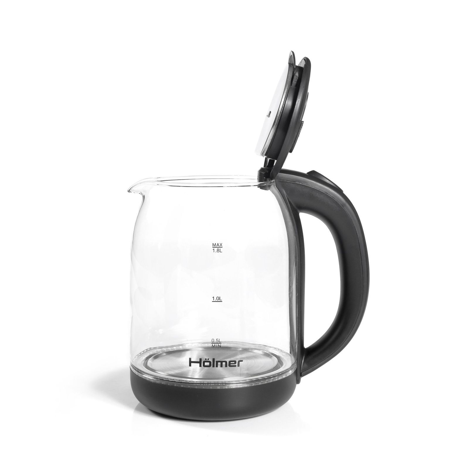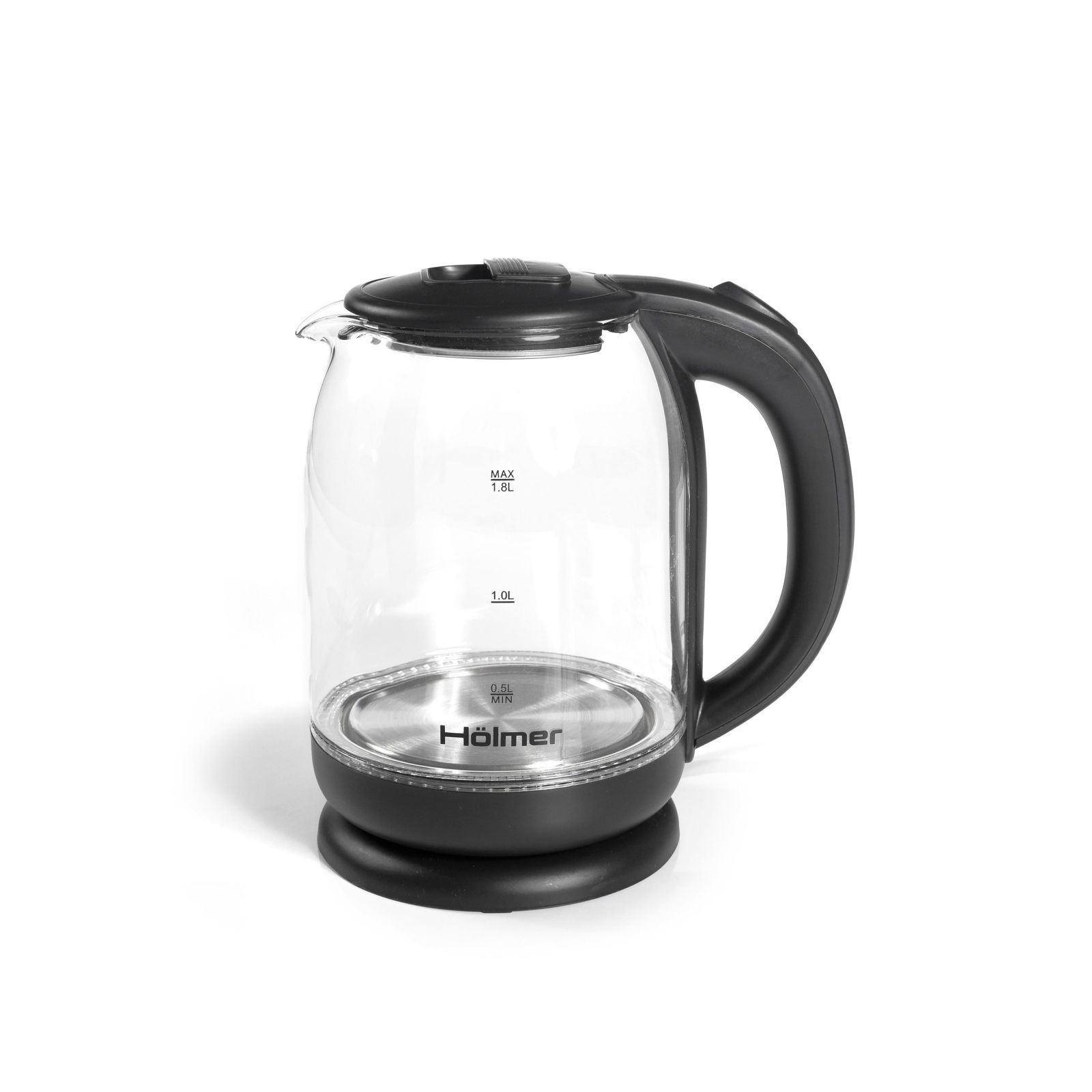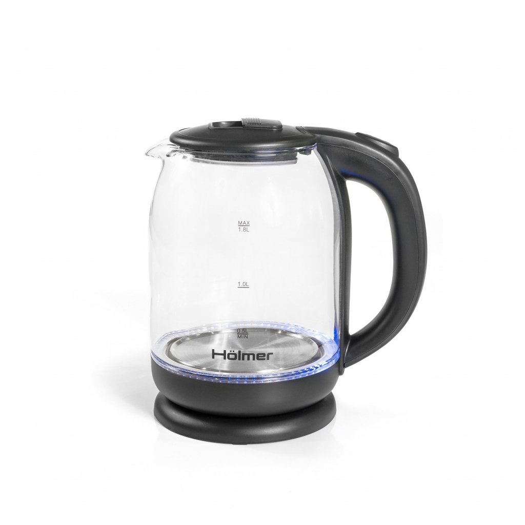 Чайник Hölmer HKG-1933 має чорний колір та матове покриття, а також LED – підсвічування яке сигналізує про роботу чайника та красиво і яскраво підсвічує воду блакитним кольором.