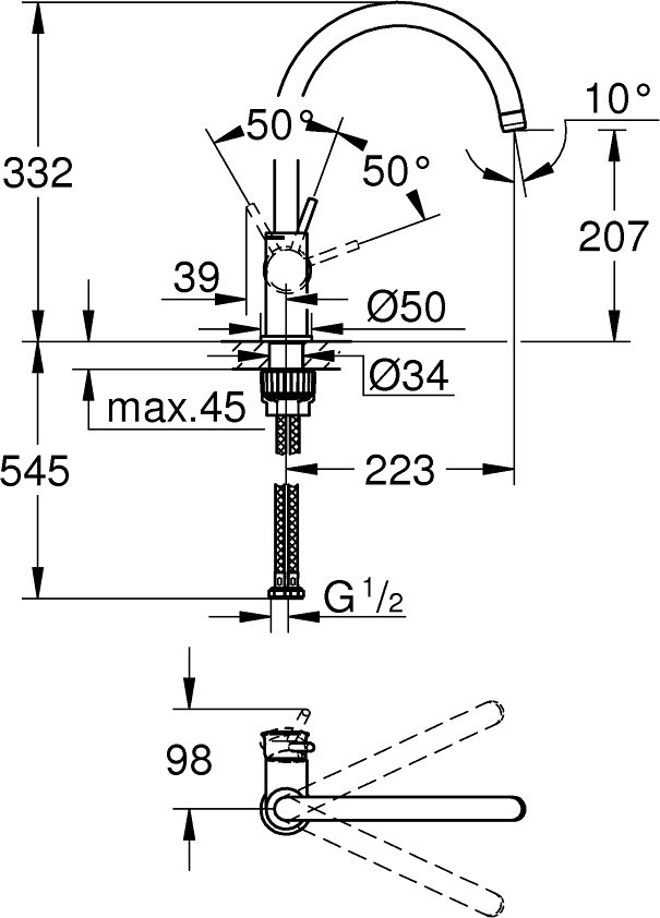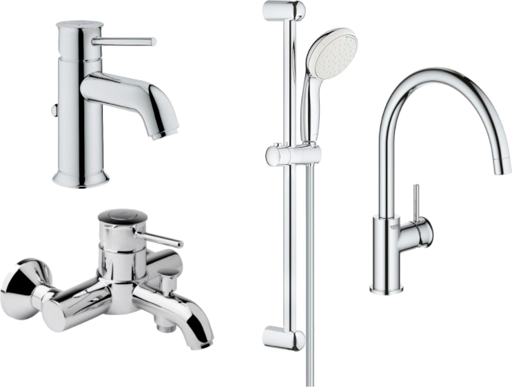• Комплектация смеситель для умывальника / Grohe BauClassic 23162000 /смеситель для кухни / Grohe BauClassic 31234001 /смеситель для ванны и душа / Grohe BauClassic 32865000 /душевой гарнитур / Grohe Tempesta 100 27598001 /стойка