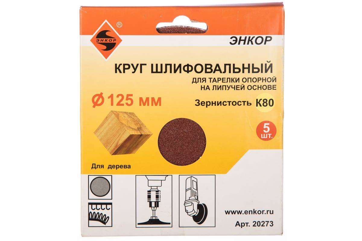 Шлифкруг Энкор 20273 используется совместно с электрическими дрелями и шлифмашинами. Крепится данная оснастка к опорной тарелке при помощи липучки, а затем опорная тарелка крепится к инструменту. Основой данного шлифкруга является бумага средней плотности, абразивным материалом — оксид алюминия, а связующим элементом базового и дополнительного покрытий - смола. Абразив занимает 50-75 % поверхности. Такой шлифкруг применяют для обработки твердых и мягких пород древесины, металлических поверхностей и лакокрасочных покрытий.