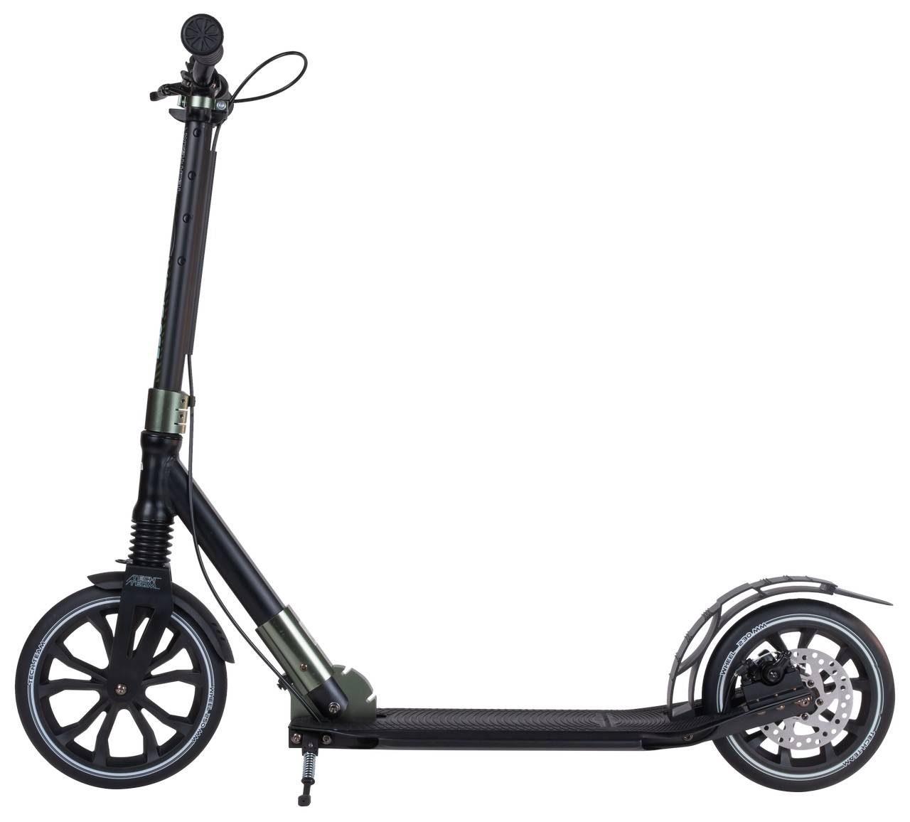 На широкой деке самоката легко можно разместиться двумя ногами . Специальное покрытие платформы не даст ноге соскользнуть. А для остановки необходимо нажать ногой на заднее крыло - тормоз. Для удобства парковки имеется подножкой.