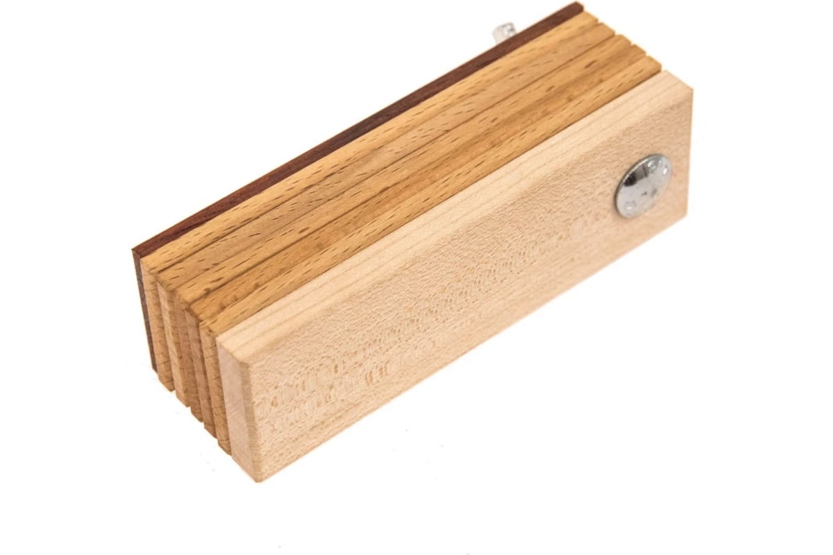 Веерная проставка для верстачных тисков - простое устройство для предотвращения перекоса и заклинивание тисков. Размер 40х120 мм состоит из 7 ламелей (4,5,5,5,5,5,10 мм). Необходимое количество веерных лепестков-проставок устанавливается так, чтобы толщина веерной вставки приблизительно соответствовала толщине детали. При зажиме деталей толщиной более 40 мм для компенсации перекоса рекомендуется совместно с веером использовать бросовые куски древесины. Это позволяет надежно закрепить заготовку и предотвращает механизм тисков от перекоса и заклинивания. Прокладки выполнены из различных пород древесины и имеют эстетический вид.