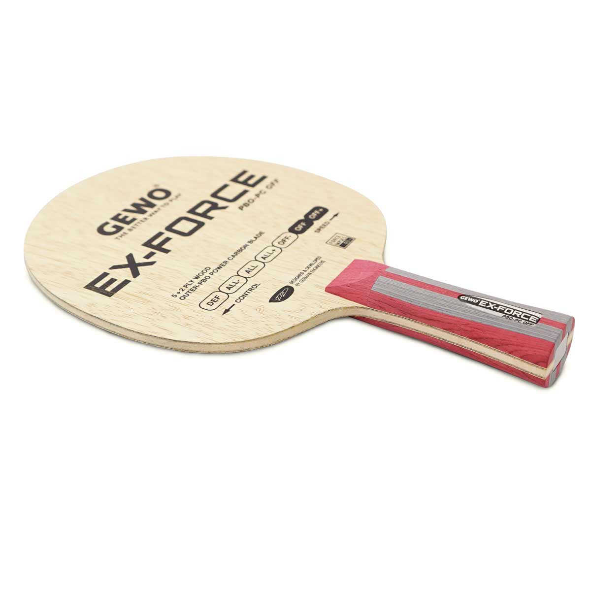 Когда дело доходит до твердости, точности и ощущения, наше основание Ex-Force PBO-PC Off просто не имеет себе равных. В отличие от варианта In-Force, синтетическое волокно Ex-Force PBO-PC Off размещено не на сердечнике, а на тонком наружном слое Limba, что делает это лезвие настоящим орудием наступления. Благодаря новому волокну PBO-PC легко появляются жесткие топспины и контр-спины, в то время как специальная техника склеивания дает всей композиции лезвий все необходимое управление даже в сочетании с твердыми резинами. Идеальное сочетание вращения, ощущения и скорости для переменной, выигрышной атаки. Будьте доминирующим с GEWO Ex-Force PBO-PC Off!