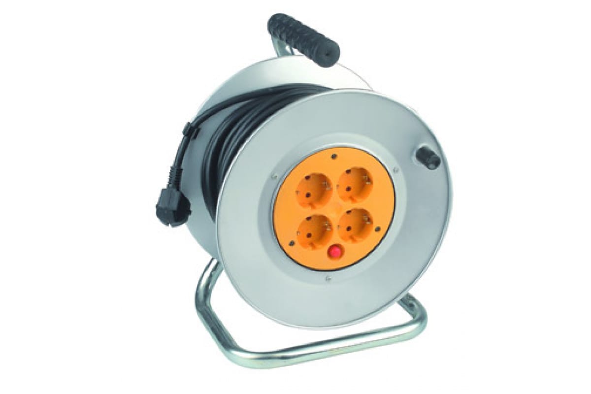 Силовой удлинитель на катушке RM-4-3x1.5-50m с заземлением, 50м, 4 гнезда ЭРА Б0001681 применяется для работы с приборами, которые находятся на строительной площадке или садовом участке. Провод длиной 50 метров закреплен на металлической катушке. Рама из металла обеспечивает устойчивость конструкции. Четыре розетки с заземлением и заглушками предотвращают попадание пыли и влаги в контакты. Терморазмыкатель защищает от перегрузок, а ручка используется для сматывания провода после работы. Можно сматывать и разматывать провод не вынимая вилок из розеток.