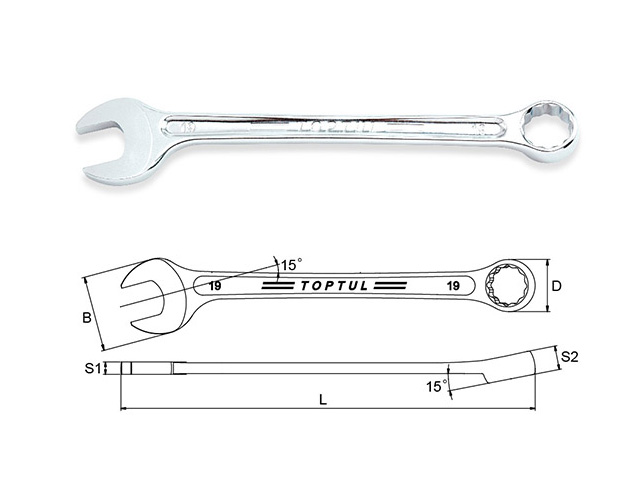 Ключ комбинированный TOPTUL имеет окончание в виде рожкового ключа с одной стороны и окончание в виде накидного ключа с 15° смещением по отношению к рукоятке с другой стороны.