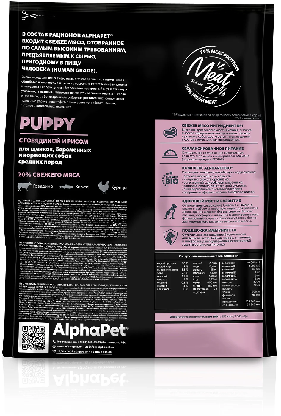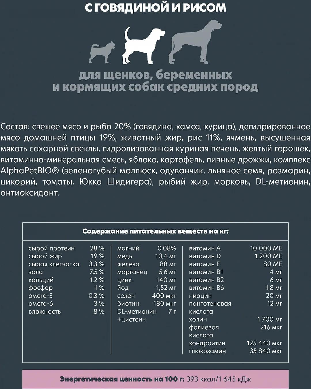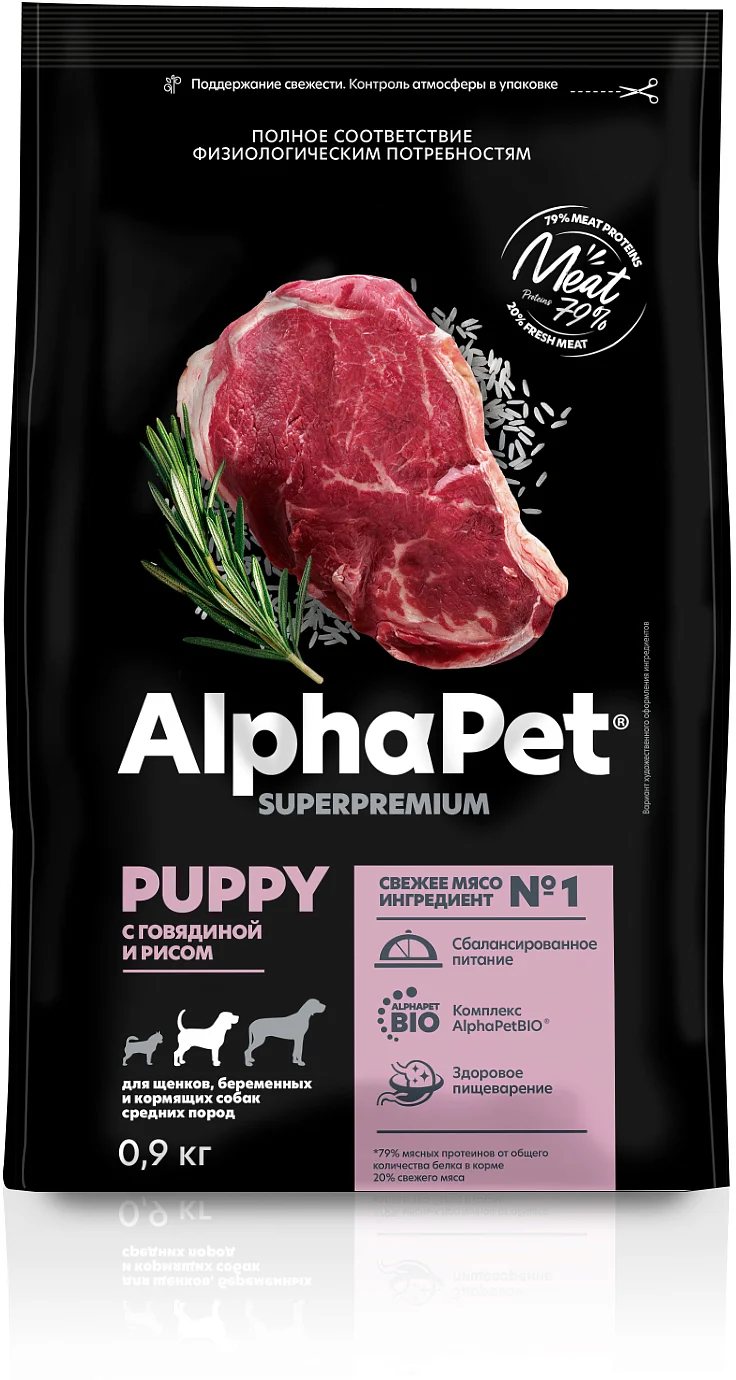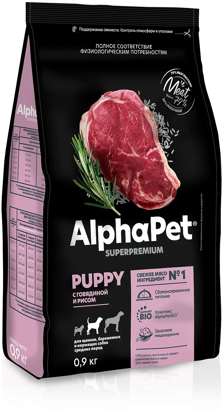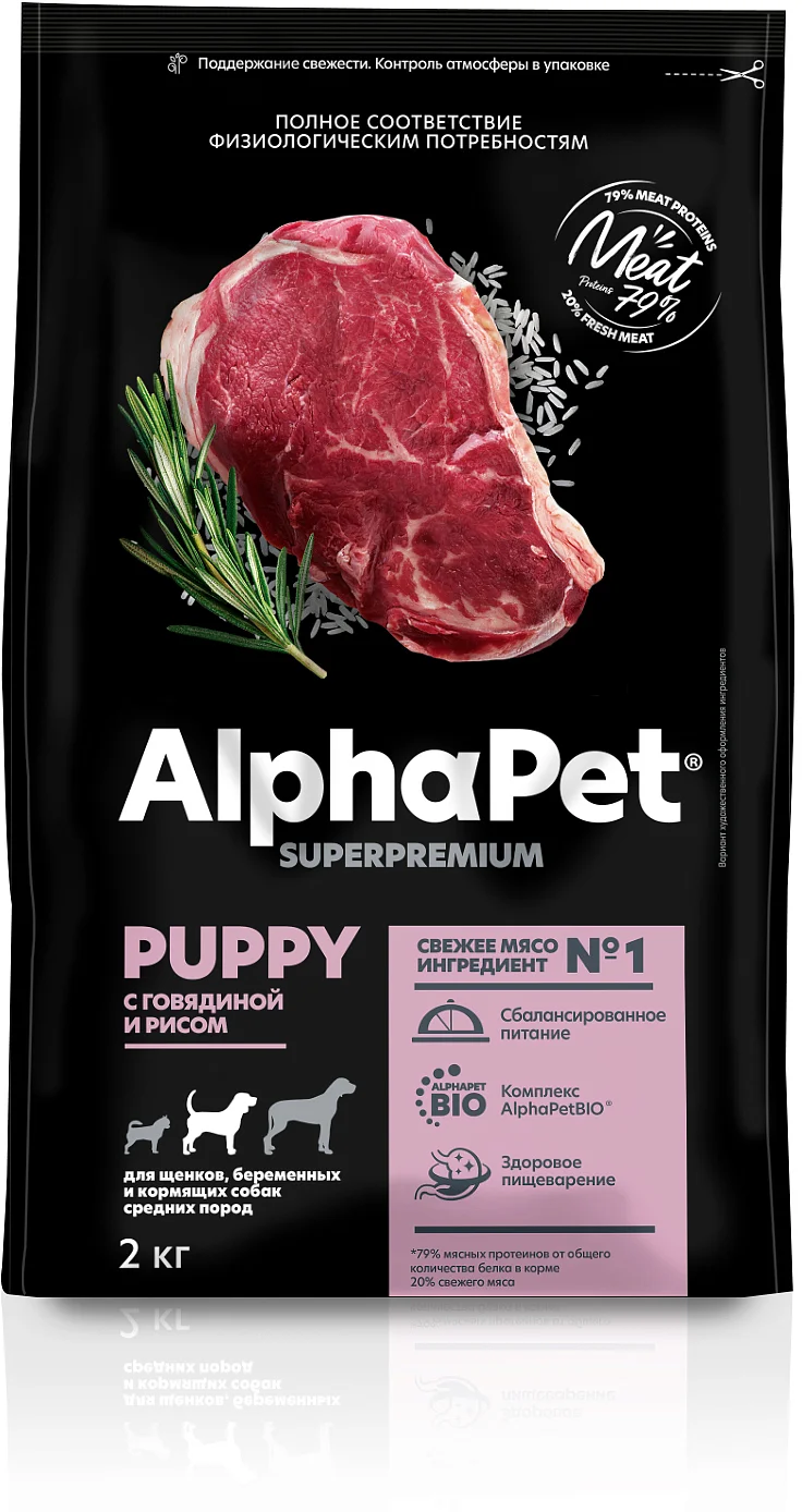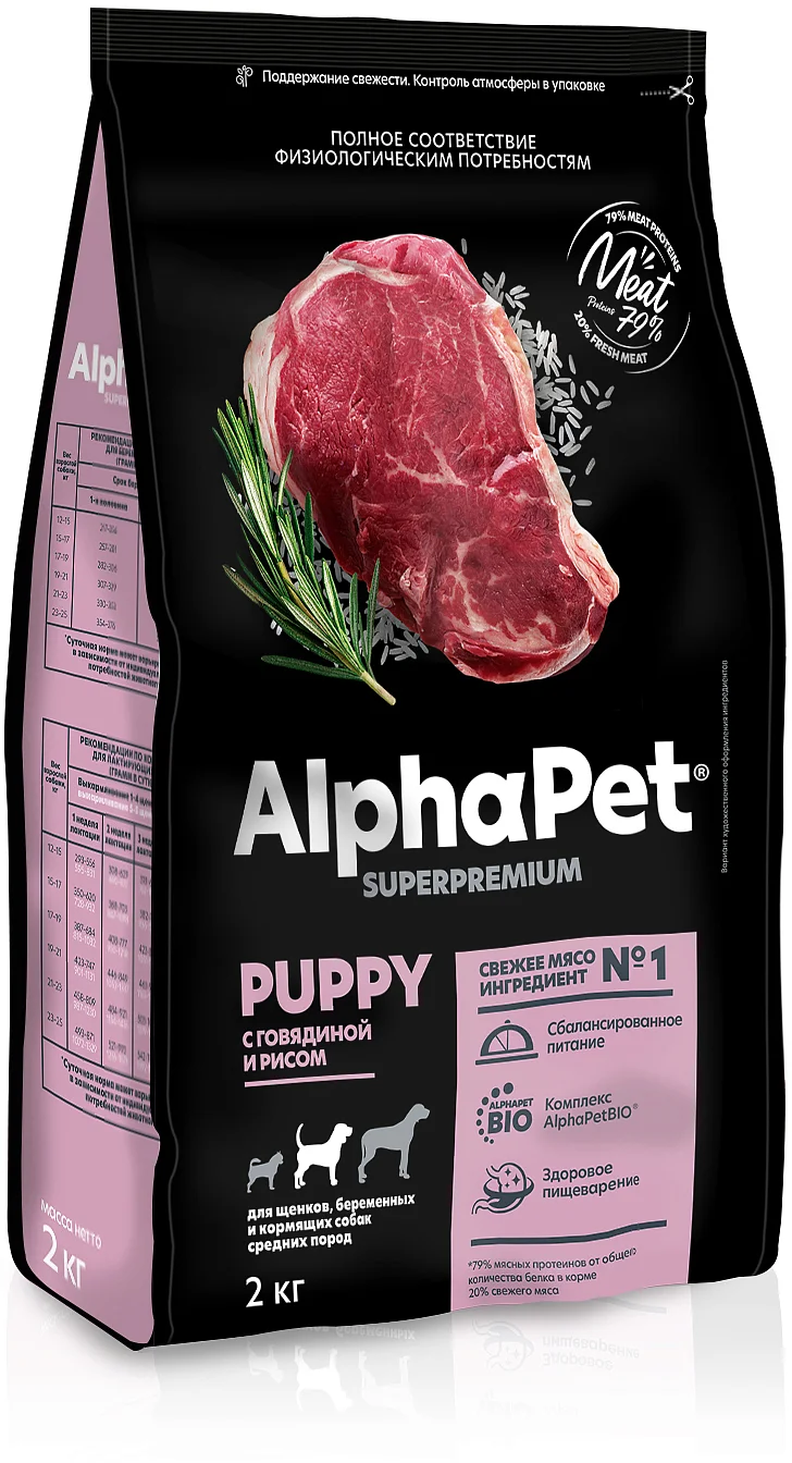 Сухой корм AlphaPet Superpremium полнорационный с говядиной и рисом для щенков, беременных и кормящих собак средних пород