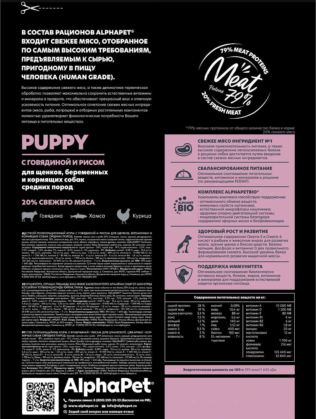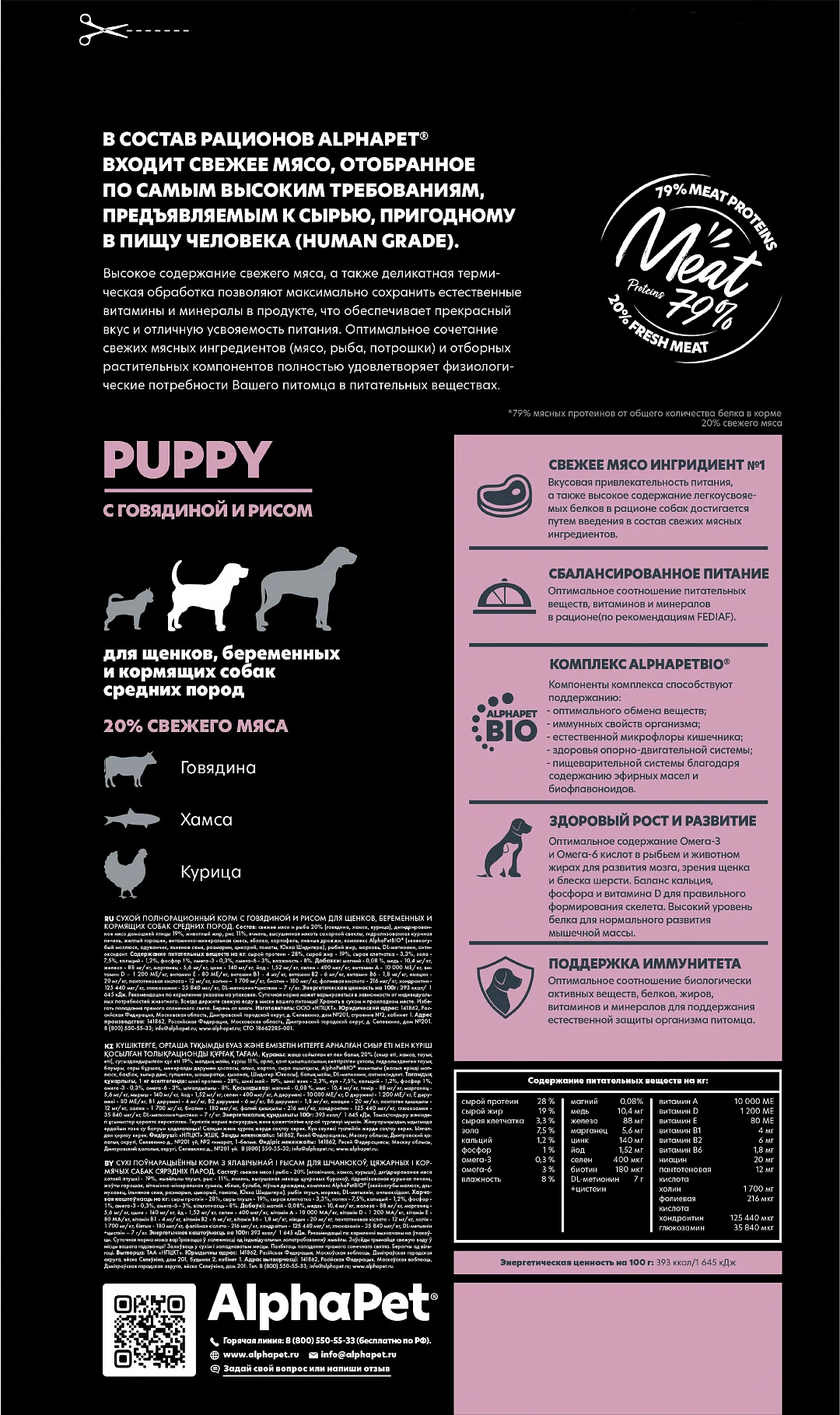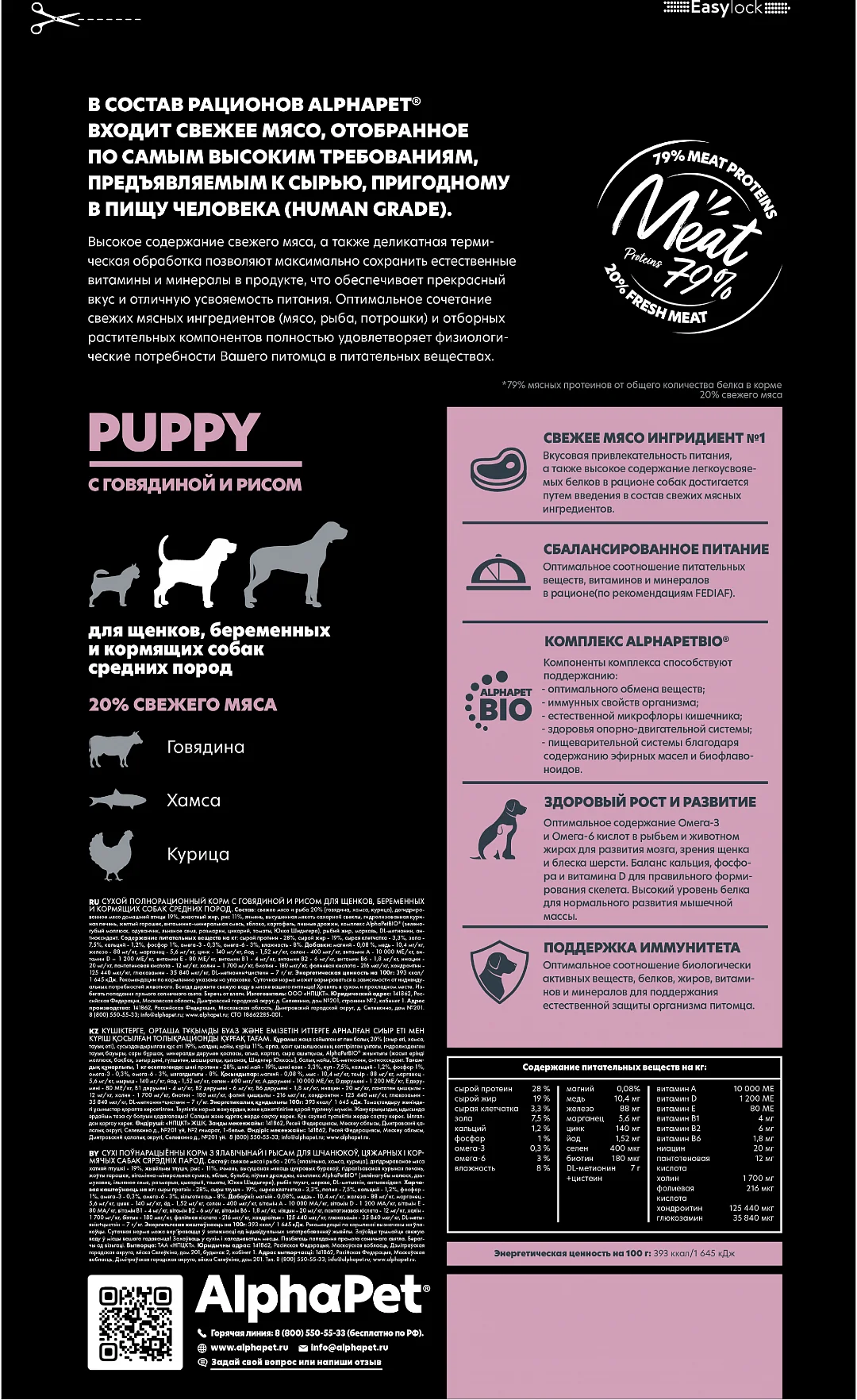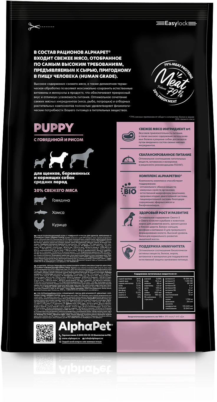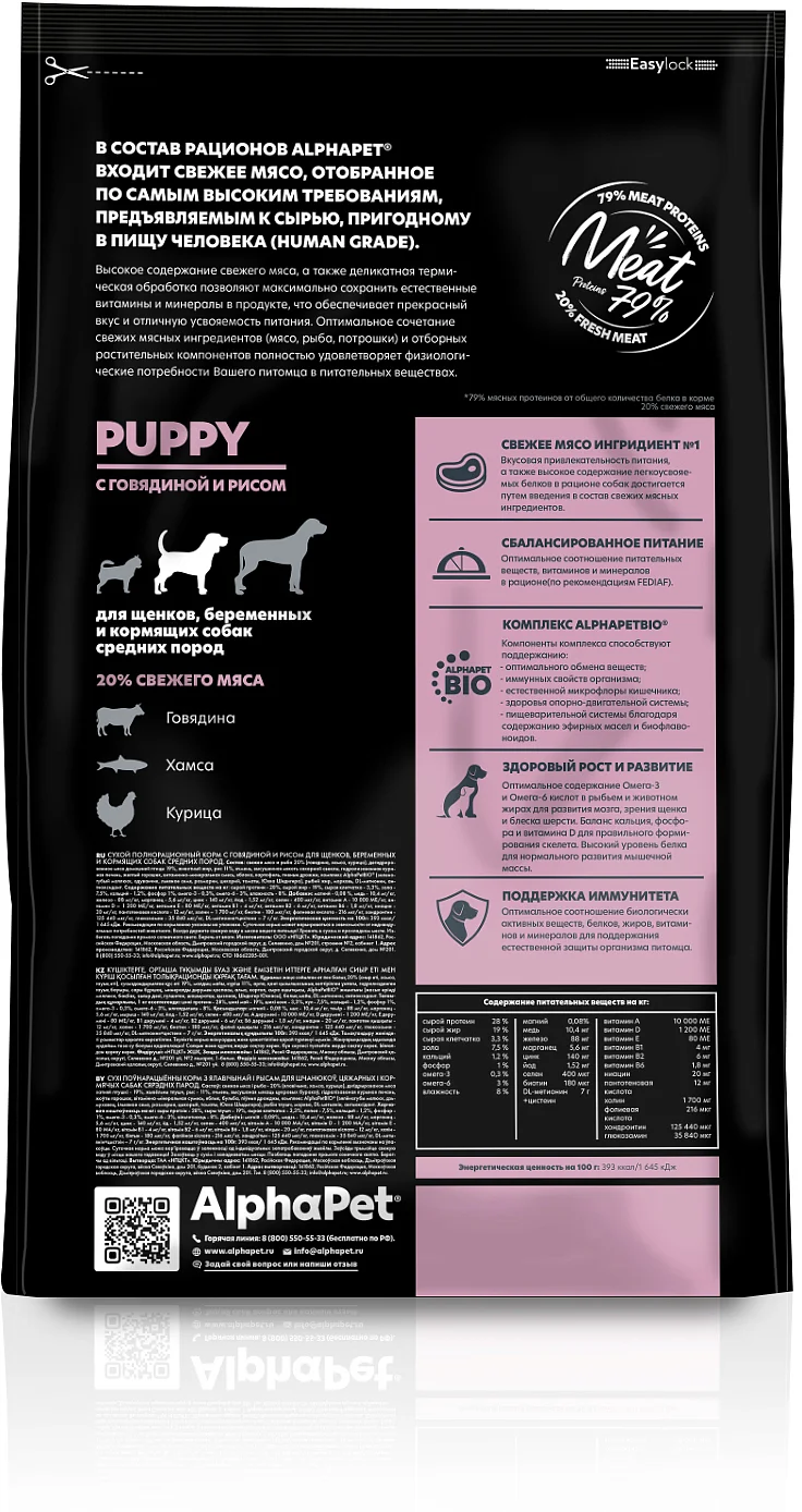 Сухой корм AlphaPet Superpremium полнорационный с говядиной и рисом для щенков, беременных и кормящих собак средних пород
