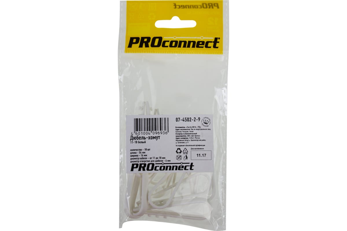 Нейлоновый дюбель-хомут PROCONNECT 11-18, белый, 10 шт. 07-4502-2-9