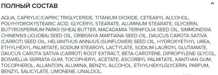 - Активные ингредиенты масло моркови, бета-каротин, масло макадамии, масло бабассу, масло босвелии