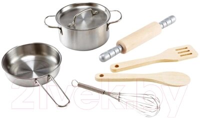 - Посуда в комплекте кастрюля, сковорода, скалка, кухонные приборы