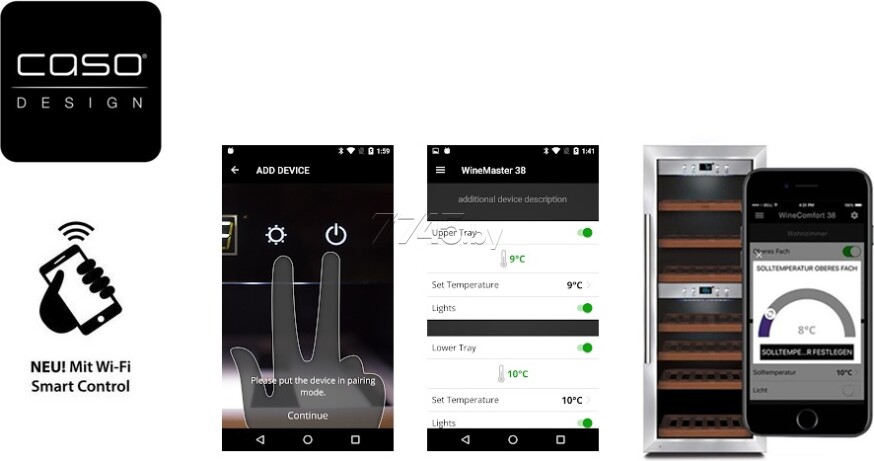 Винный шкаф CASO WineChef Pro 40 благодаря расположению охлаждения снизу можно встраивать или использовать как отдельно стоящий. Позволяет хранить до 40 бутылок (стандартная бутылка типа Бордо). Прибор имеет 2 температурные зоны с установкой температуры от 5° до 20° C. Дверца холодильника с двойным стеклом, рама изготовлена из нержавеющей стали. Светодиодная подсветка с возможностью отключения. Сенсорное управление. Тихий компрессор.