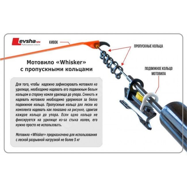 Предназначено для ловли летним кивком или поплавком в различных условиях с разрывной нагрузкой лески до 5 кг. Наиболее комфортная для использования этого мотовила глубина 1 - 9 метров. Это мотовило имеет небольшой вес и специальную самозажимную конструкцию крепления к удилищу. В комплекте с мотовилом идут съемные пропускные кольца. Для эффективной работы самозажимного мотовила, необходимо надевать его на удочку подвижным белым кольцом в сторону комля до упора. Надевать и снимать мотовило необходимо, удерживая за белое подвижное кольцо. Рекомендуется применять с летними кивками серии "Whisker".