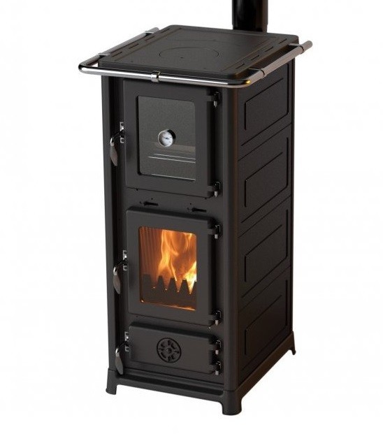 Печь оснащена большой чугунной плитой с одной конфоркой и стальным эмалированным духовым шкафом для приготовления пищи. По периметру варочной поверхности расположен хромированный ограничитель для защиты от ожогов.