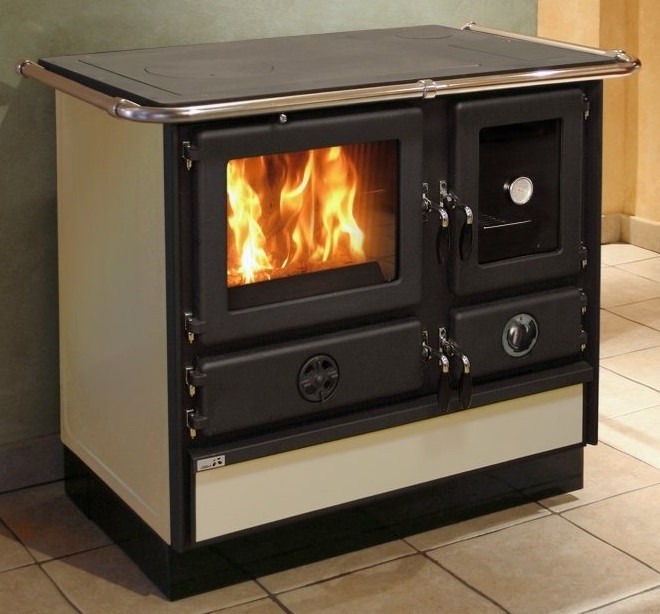 Кухонная печь MBS Super Thermo Magnum Plus изготовлена из эмалированной стали, а дверцы, верхняя плита и топочная камера - из чугуна.