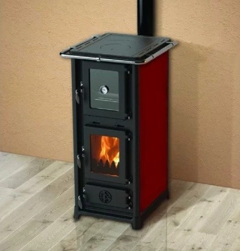 Печь-камин MBS Olympia Plus изготовлена из эмалированной стали, топочная, поддувальная и дверца духового шкафа, а также верхняя плита и основание печи - из чугуна. Камера сгорания также выложена чугунными пластинами.Печь может отопить до 60 - 80 м2 в зависимости от качества утепления здания.Печь оснащена большой чугунной плитой с одной конфоркой и стальным эмалированным духовым шкафом для приготовления пищи. По периметру варочной поверхности расположен хромированный ограничитель для защиты от ожогов.В нижней части печи расположен выдвижной вместительный ящик для хранения посуды или дров.Размер духовки ВхШхГ - 280х270х420 мм. Она оснащена эмалированным протвенем и термостатом.Размер топочной камеры ВхШхГ - 300х290х365 мм.Зольный ящик у печи очень глубокий, благодаря чему пепел придется выбрасывать реже. Он изготовлен из такой же эмалированной стали, как и сам корпус печи. Такое покрытие обеспечит ему долгий срок службы. Доступ к зольному ящику осуществляется через чугунную герметичную дверцу с регулятором тонкой подачи воздуха.Чугунные вкладыши в топке обеспечивают надежность и долгий срок службы печи.По бокам печи расположен конвекционных кожух благодаря которому теплый воздух быстрее распространяется по помещению.В нижней части печи расположен ящик для хранения посуды или дров.Дверца печи герметичная, она имеет термостойкий уплотнительный шнур как по периметру створки, так и по периметру стекла. Чугунная поддувальная дверца также герметичная. Это позволяет осуществлять тонкую дозированную подачу воздуха в топочную камеру при помощи круглого регулятора, что является важнейшим фактором, влияющим на длительность горения.На задней внутренней стенке топочной камеры расположены отверстия вторичного дожига газов, сквозь которые в камеру сгорания попадает дополнительная порция воздуха и вступает в реакцию горения с частицами топлива. Благодаря этому несгоревшие частицы сажи догорают, дымоход и стекло остаются более чистыми, КПД печи повышается.В верхней части печи расположена ручка третичной подачи воздуха на стекло (система "чистое стекло"), благодаря которой воздушный поток направляется на стекло и, вступая в реакцию горения, выжигает налет сажи на нем и препятствует дальнейшему оседанию копоти на стекле.Печь имеет европейский сертификат CE.Эмалированный корпус печи может быть окрашен в бежевый, черный, бордовый или красный цвет.Печь имеет весьма привлекательный дизайн. Топочная и поддувальная дверцы, а также верхняя панель печи в стенки топочной камеры отлиты из чугуна, что придает ей надежность и богатый внешний вид. Большая чугунная топочная дверь укомплектована термостойкой стеклокерамикой. Все это вместе с привлекательной ценой делает печь MBS Olympia Plus достойным вариантом отопления для дачи либо загородного дома.