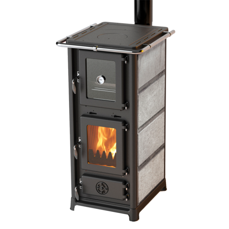 Печь-камин MBS Olympia Plus изготовлена из эмалированной стали, топочная, поддувальная и дверца духового шкафа, а также верхняя плита и основание печи - из чугуна. Камера сгорания также выложена чугунными пластинами. Внешние декоративные панели изготовлены из натурального камня.Печь может отопить до 60 - 80 м2 в зависимости от качества утепления здания.Печь оснащена большой чугунной плитой с одной конфоркой и стальным эмалированным духовым шкафом для приготовления пищи. По периметру варочной поверхности расположен хромированный ограничитель для защиты от ожогов.В нижней части печи расположен выдвижной вместительный ящик для хранения посуды или дров.Размер духовки ВхШхГ - 280х270х420 мм. Она оснащена эмалированным протвенем и термостатом.Размер топочной камеры ВхШхГ - 300х290х365 мм.Зольный ящик у печи очень глубокий, благодаря чему пепел придется выбрасывать реже. Он изготовлен из такой же эмалированной стали, как и сам корпус печи. Такое покрытие обеспечит ему долгий срок службы. Доступ к зольному ящику осуществляется через чугунную герметичную дверцу с регулятором тонкой подачи воздуха.Чугунные вкладыши в топке обеспечивают надежность и долгий срок службы печи.По бокам печи расположен конвекционных кожух благодаря которому теплый воздух быстрее распространяется по помещению. Боковые панели изготовлены из натурального камня талькохлорита, который имеет привлекательный внешний вид, а также славится своими теплонакопительными свойствами.В нижней части печи расположен ящик для хранения посуды или дров.Дверца печи герметичная, она имеет термостойкий уплотнительный шнур как по периметру створки, так и по периметру стекла. Чугунная поддувальная дверца также герметичная. Это позволяет осуществлять тонкую дозированную подачу воздуха в топочную камеру при помощи круглого регулятора, что является важнейшим фактором, влияющим на длительность горения.На задней внутренней стенке топочной камеры расположены отверстия вторичного дожига газов, сквозь которые в камеру сгорания попадает дополнительная порция воздуха и вступает в реакцию горения с частицами топлива. Благодаря этому несгоревшие частицы сажи догорают, дымоход и стекло остаются более чистыми, КПД печи повышается.В верхней части печи расположена ручка третичной подачи воздуха на стекло (система "чистое стекло"), благодаря которой воздушный поток направляется на стекло и, вступая в реакцию горения, выжигает налет сажи на нем и препятствует дальнейшему оседанию копоти на стекле.Печь имеет европейский сертификат CE.Эмалированный корпус печи может быть окрашен в бежевый, черный, бордовый или красный цвет.Печь имеет весьма привлекательный дизайн. Топочная и поддувальная дверцы, а также верхняя панель печи в стенки топочной камеры отлиты из чугуна, что придает ей надежность и богатый внешний вид. Большая чугунная топочная дверь укомплектована термостойкой стеклокерамикой. Все это вместе с привлекательной ценой делает печь MBS Olympia Plus достойным вариантом отопления для дачи либо загородного дома.