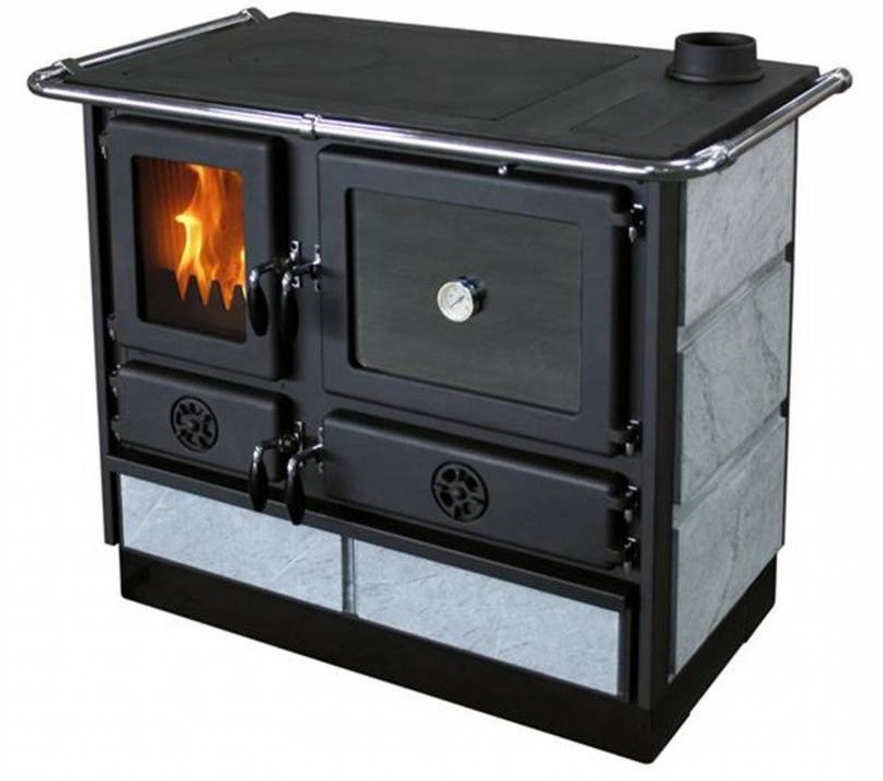 Плита на дровах предназначена для отопления помещения и приготовления пищи на варочной поверхности и в духовом шкафу.Кухонная печь MBS Magnum Plus S изготовлена из эмалированной стали, а дверцы, верхняя плита и топочная камера - из чугуна. Боковые панели изготовлены из натурального камня талькохлорита, который имеет привлекательный внешний вид, а также славится своими теплонакопительными свойствами.Печь может отопить до 55 - 72 м2 в зависимости от качества утепления здания.Печь оснащена большой чугунной плитой с одной конфоркой и стальным эмалированным духовым шкафом для приготовления пищи. По периметру варочной поверхности расположен хромированный ограничитель для защиты от ожогов.В нижней части печи расположен выдвижной вместительный ящик для хранения посуды или дров.Размер духовки ВхШхГ - 270х350х470 мм. Она оснащена эмалированным протвенем и термостатом.Размер чугунной топочной камеры ВхШхГ - 270х270х350 мм.Дымоход диаметром 120мм может быть расположен слева или справа на верхней либо задней панели.Дверцы печи герметичные, они имеют термостойкий уплотнительный шнур как по периметру створки, так и по периметру стекла. Это позволяет осуществлять тонкую дозированную подачу воздуха в топочную камеру, что является важнейшим фактором, влияющим на длительность горения.Чугунная колосниковая решетка оснащена функцией принудительного сброса золы, благодаря которой не придется лишний раз открывать топочную дверцу и применять кочергу.Печь имеет европейский сертификат CE.