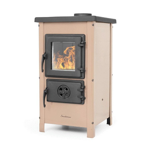 Печь-камин MBS Happy E изготовлена из стали, дверца и верхняя плита из чугуна, а топочная камера выложена огнеупорным шамотом.Печь может отопить до 30 - 40 м2 в зависимости от качества утепления здания.Верхняя чугунная панель может использоваться для разогрева или приготовления пищи.Размер топочной камеры ВхШхГ - 250х270х300 мм.Зольный ящик у печи очень глубокий, благодаря чему пепел придется выбрасывать реже. Он изготовлен из такой же эмалированной стали, как и сам корпус печи. Такое покрытие обеспечит ему долгий срок службы. Доступ к зольному ящику осуществляется через чугунную герметичную дверцу с регулятором тонкой подачи воздуха.Шамот в топочной камере не только защищает корпус печи от прогорания, но и способствует увеличению КПД и лучшей очистке стекла от сажи. Шамотный кирпич способствует повышению температуры внутри топочной камеры, а значит более полному сгоранию дров. Поэтому в печах, футерованных шамотом, всегда в зольном ящике остается меньше пепла. Также шамот аккумулирует тепло, благодаря чему печь дольше остается теплой.Дверца печи герметичная, она имеет термостойкий уплотнительный шнур как по периметру створки, так и по периметру стекла. Это позволяет осуществлять тонкую дозированную подачу воздуха в топочную камеру, что является важнейшим фактором, влияющим на длительность горения.Печь имеет европейский сертификат CE. Печь, соответсвующая европейским стандартам имеет небольшие выбросы углекислого газа CO в окружающую среду. Говоря простым языком, при горении в печи MBS Happy E топливо сгорает максимально эффективно, а в дымоход улетает минимум сажи. Сажа - это не сгоревшие дрова. Если сажи мало, значит КПД высокий, меньше коптиться стекло, меньше пепла остается в зольнике, реже нужно чистить дымоход.Эмалированный корпус печи может быть окрашен в кремовый, серый, черный или красный цвет.Печь имеет весьма привлекательный дизайн. Топочная и поддувальная дверцы, а также верхняя панель печи отлиты из чугуна, что придает ей надежность и богатый внешний вид. Камера сгорания печи надежно защищена огнеупорным шамотом. Все это вместе с привлекательной ценой делает печь MBS Happy E достойным вариантом отопления помещения на даче либо в загородном доме.