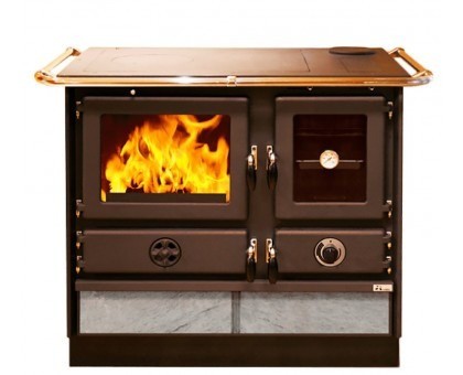 Плита на дровах предназначена для отопления помещения и приготовления пищи на варочной поверхности и в духовом шкафу. В модификации Thermo плиту можно подключить к системе отопления дома. Объем водяного контура 19л. Мощность, которую печь отдает на нагрев теплоносителя равна 10 кВт. Мощность, которую печь отдает на обогрев воздуха в помещении также равна 10 кВт. Таким образом общая мощность составляет 20 кВт.Кухонная печь MBS Super Thermo Magnum Plus S изготовлена из эмалированной стали, а дверцы, верхняя плита и топочная камера - из чугуна. Боковые панели изготовлены из натурального камня талькохлорита, который имеет привлекательный внешний вид, а также славится своими теплонакопительными свойствами.Печь может отопить до 100 - 130 м2 в зависимости от качества утепления здания.Печь оснащена большой чугунной плитой с одной конфоркой и стальным эмалированным духовым шкафом для приготовления пищи. По периметру варочной поверхности расположен хромированный ограничитель для защиты от ожогов.В нижней части печи расположен выдвижной вместительный ящик для хранения посуды или дров.Размер духовки ВхШхГ - 272х270х420 мм. Она оснащена эмалированным протвенем и термостатом.Размер чугунной топочной камеры ВхШхГ - 320х400х410 мм.Дымоход диаметром 120мм может быть расположен слева или справа на верхней либо задней панели.Дверцы печи герметичные, они имеют термостойкий уплотнительный шнур как по периметру створки, так и по периметру стекла. Это позволяет осуществлять тонкую дозированную подачу воздуха в топочную камеру, что является важнейшим фактором, влияющим на длительность горения.Чугунная колосниковая решетка оснащена функцией принудительного сброса золы, благодаря которой не придется лишний раз открывать топочную дверцу и применять кочергу.Печь имеет европейский сертификат CE.