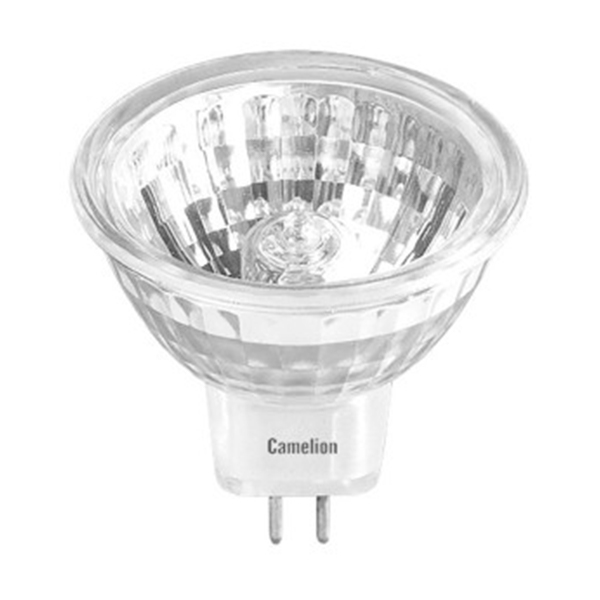 Галогенная лампа Camelion 7093 сетевого напряжения с дихроичным отражателем, уменьшающим тепло в световом пучке до 66%, без защитного стекла.