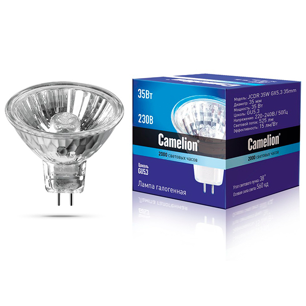 Галогенная лампа Camelion 7092 сетевого напряжения с дихроичным отражателем, уменьшающим тепло в световом пучке до 66%, без защитного стекла.