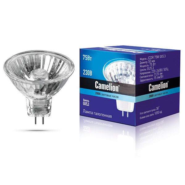 Галогенная лампа Camelion 1954 сетевого напряжения с дихроичным отражателем и защитным стеклом - JCDR, 220 В. Яркий искрящийся свет и идеальная цветопередача создают эффект "бриллиантового света". Срок службы 2000 ч.