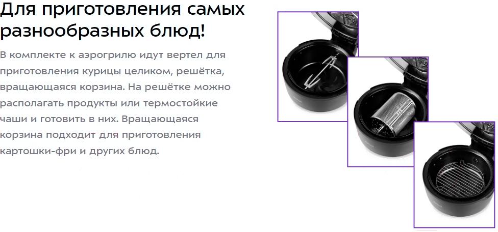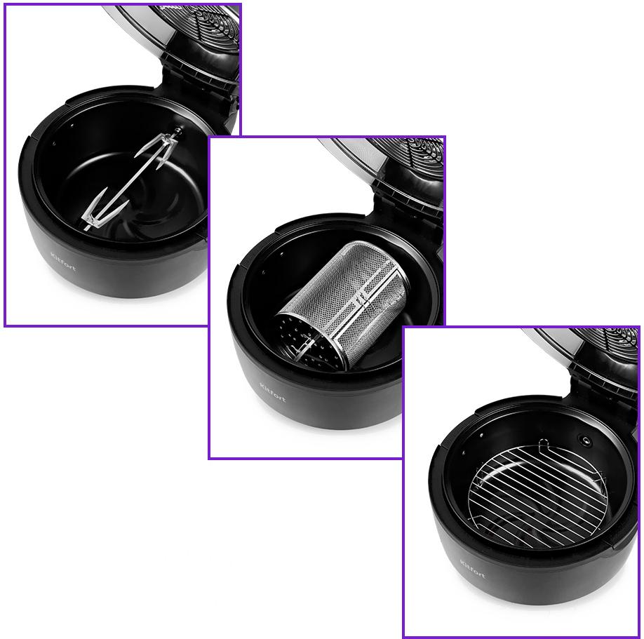 • В комплекте щипцы-ухваты, низкая решетка, поддон, вертел, вращающаяся корзина