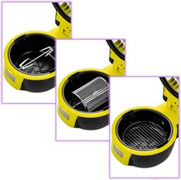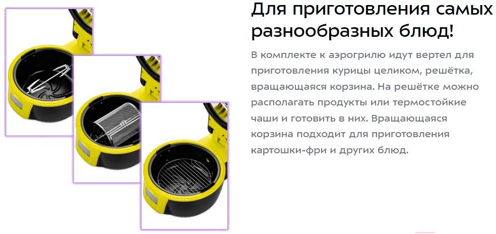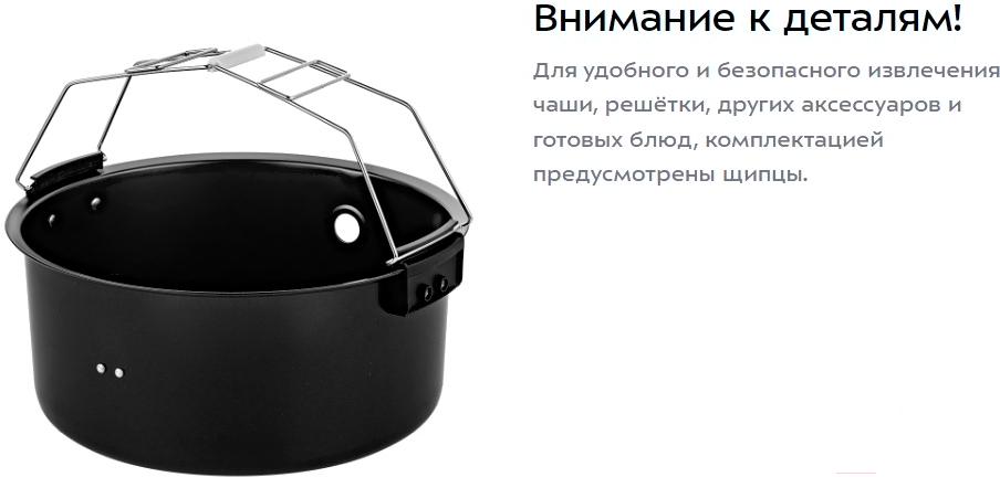 • В комплекте щипцы-ухваты, шампуры, низкая решетка, поддон (противень), вертел, вращающаяся корзина, решетка для стейка