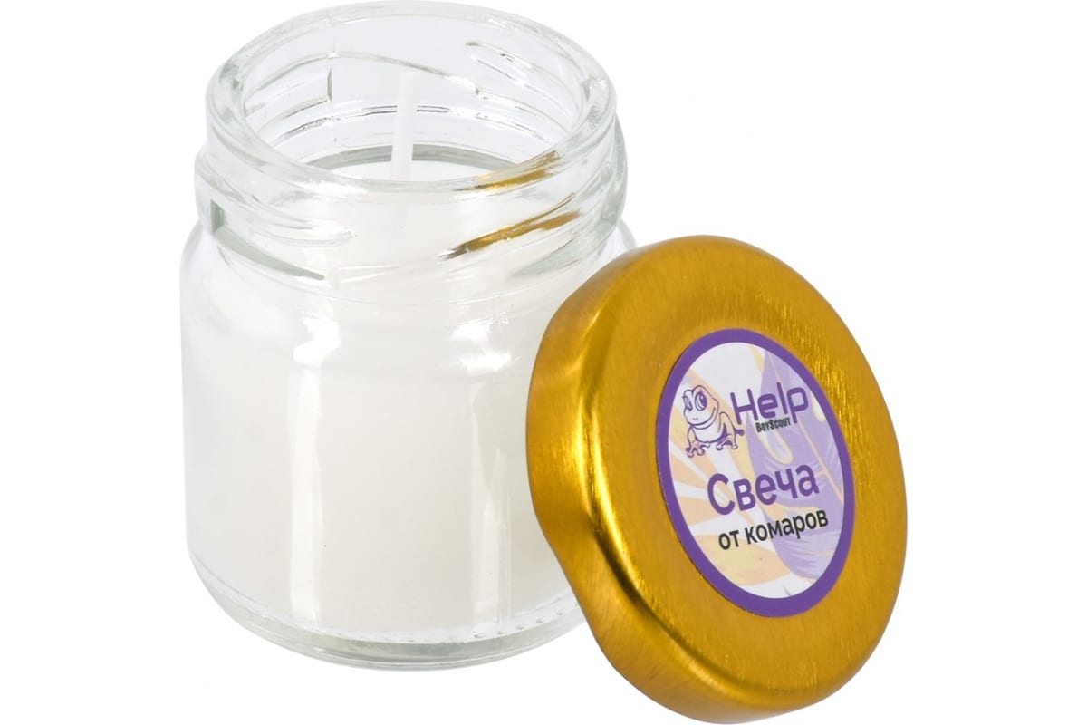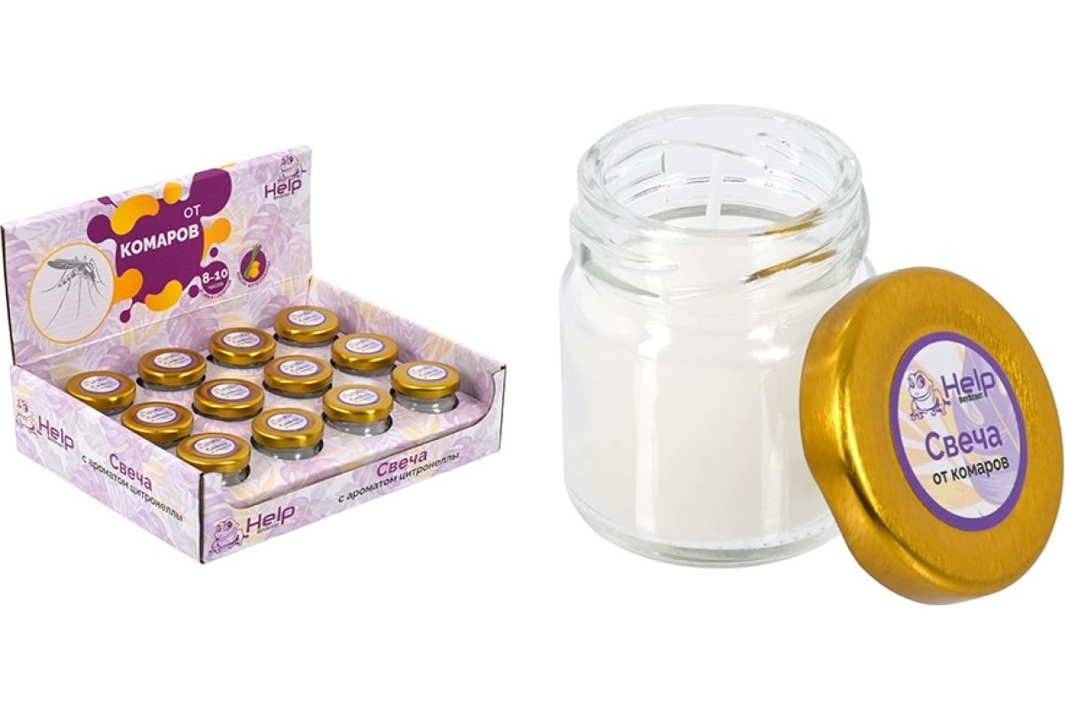 Свеча HELP с ароматом цитронеллы, в стеклянной баночке, в дисплей-боксе 80445 - это безопасное средство защиты от комаров в помещении и на открытом воздухе.