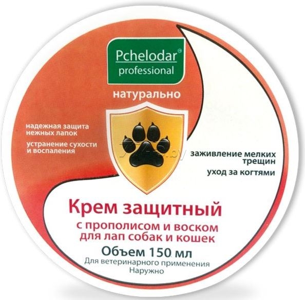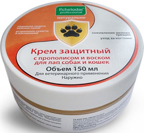 Крем для животных PCHELODAR Защитный для лап с прополисом и воском 150 мл – инновационное средство для защиты лап животных во время прогулки от неблагоприятного воздействия противогололёдных химических реагентов и низких температур, для предотвращения травмирования кожи подушечек лап снежным настом, гравием или асфальтом. Входящие в состав натуральный пчелиный воск, экстракт прополиса и ланолин создают надежную защитную пленку на подушечках лап животного, оказывают выраженное антисептическое, успокаивающее и ранозаживляющее действие. Натуральные растительные масла и витамин Е прекрасно увлажняют, питают и восстанавливают кожу лап животных, обеспечивая быстрое заживление мелких ран и трещин. Крем способствует размягчению загрубевшей и утолщенной кожи подушечек лап. Характеризуется экономичным расходом и отсутствием липкости. Не загрязняет поверхность, легко смывается любым гигиеническим средством. Натуральные компоненты крема позволяют применять его даже самым чувствительным животным, склонным к аллергическим реакциям, а также щенкам и котятам.