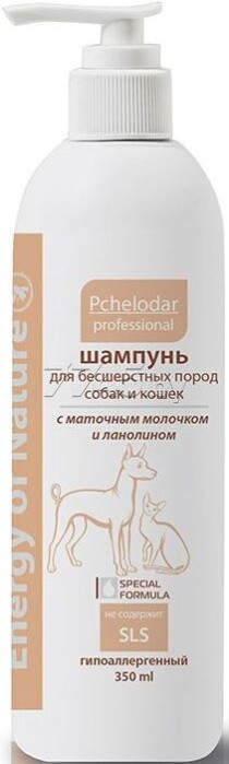 Шампунь для бесшерстных животных PCHELODAR 350 мл – специально разработанный нежный шампунь для поддержания здоровья кожи собак и кошек бесшерстных пород. Помогает бережно очистить даже самую чувствительную кожу животного от загрязнений и избыточного количества сальных выделений, успокоить ее и устранить дискомфорт, вызванный зудом, перхотью, шелушением и раздражением. Натуральные компоненты и провитамин В5, входящие в состав шампуня, оказывают усиленное увлажняющее, питающее, антисептическое и восстанавливающее действие. Шампунь заботливо защищает кожу животного от UV-излучения и других неблагоприятных воздействий окружающей среды, препятствует проникновению грязи и отталкивает пыль. Дезодорирует, помогает нормализовать работу сальных желез, восстанавливает барьерную функцию кожного покрова и снижает риск развития дерматологических заболеваний. При регулярном применении шампуня кожа животного приобретает невероятную бархатистость, мягкость и чистоту. За счет гипоаллергенной формулы шампунь подходит животным с чувствительной кожей, склонной к аллергическим реакциям, а также щенкам и котятам. Имеет оптимальный уровень pH для кожи и не влияет на эффективность инсектоакарицидной обработки животного.