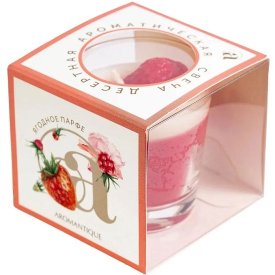 Свеча ароматическая AROMANTIQUE Ягодное парфе, 25 чАроматическая свеча Aromantique с ароматом Ягодное парфе создаст атмосферу уюта и тепла, а также подарит хорошее настроение.Букет эфирных масел поможет снять стресс и наполнит Ваше пространство тонким ароматом цветов, ягод и фруктов.Свечи изготовлены вручную из высококлассного парафинового воска, соевого и пчелиного воска и качественных эфирных масел от лучших мировых производителей ароматов.Соединяя в себе аромат и мягкий свет, свеча мгновенно создаст в доме теплую и уютную атмосферу. Станет прекрасным подарком на любой праздник.Совет: Для достижения лучшего уровня ароматизации, необходимо, чтобы свеча горела не менее 20 минут.Время горении свечи - 25-30 часов.Описание аромата:Верхние ноты - малина, земляника.Средние ноты - роза, фрезия.Базовые ноты - сандал, ваниль, мускус.