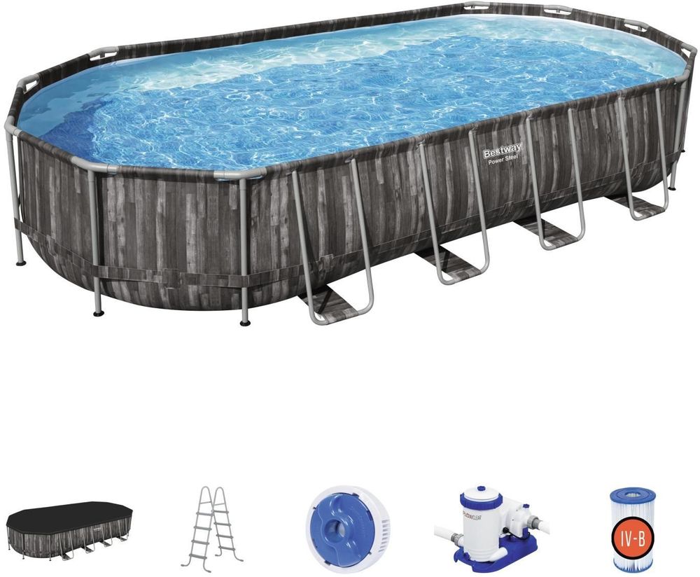 Семейный, каркасный, овальный, 25495 л, сливной клапан, комплектация: тент-чехол, лестница, фильтр-насос, картриджный фильтр.