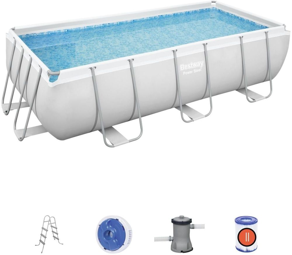 Семейный, каркасный, прямоугольный, 6478 л, сливной клапан, комплектация: лестница, фильтр-насос, картриджный фильтр.
