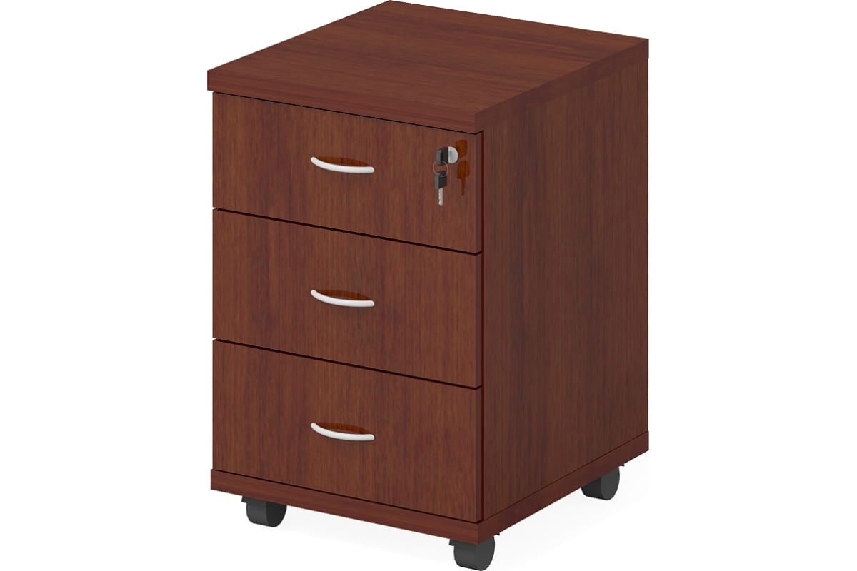 Офисная тумба ФЕЛИКС 42.7x45.8x63.2 см миланский орех темный ПК-ЛОГ-ТММ43Х46-В1-34 создает удобное хранение документов, офисных принадлежностей, личных вещей сотрудника. Тумба мобильная имеет 3 обычных ящика. Верхний ящик запирается замком. Ящики устанавливаются на роликовые направляющие. Верхняя полка изготавливается из ЛДСП 16 мм и кромкой ПВХ 2 мм. Нижняя полка изготовлена из ЛДСП, по 4 сторонам покрыта тонкой пластиковой кромкой. Все другие детали изготавливаются из ЛДСП 16 мм и покрыты ПВХ 0,45 мм. Каркасы ящиков в тумбе приставной состоят из фолдингов, передних панелей и дна изготовленного из древесноволокнистой плиты (ДВП) толщиной 3,2 мм. Ручки – пластиковые скобы (межцентровое расстояние – 96 мм). Мобильная тумба устанавливается на роликовые опоры.