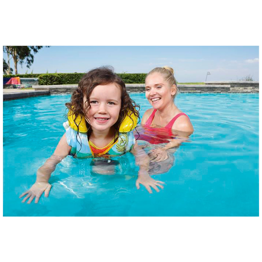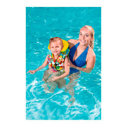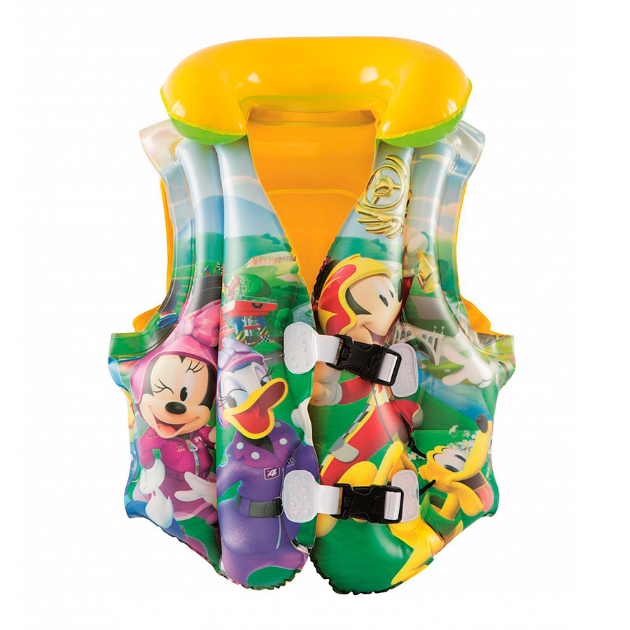 Жилет разделен на 3 воздушные камеры. Благодаря такой конструкции он удержит ребенка наплаву, даже если одна из секций пробьется. Мягкий виниловый материал приятен наощупь, прочен и не пахнет. Надувной воротник поддержит голову неумелого пловца. А парная застежка-карабин легко застегивается и регулируется.