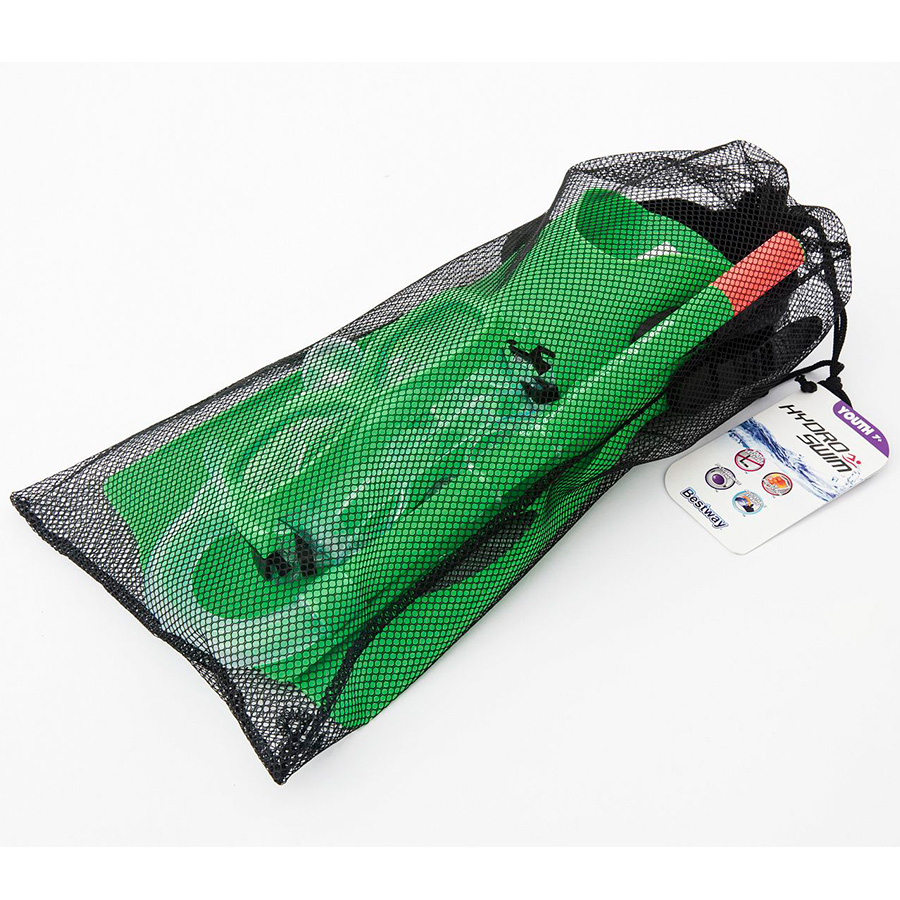 В детский набор для подводного плавания 25020 вхоят маска, трубка, ласты 41-44 размера. Из плюсов стоит отметить безопасную форму стекла, мягкую, плотно прилегающую резину, полностью регулируемый ремешок, удобный загубник трубки, предохранитель на конце трубки предотвращает любое попадание воды, мягкие удобные ласты с регулируемым ремешком на пятке.