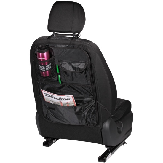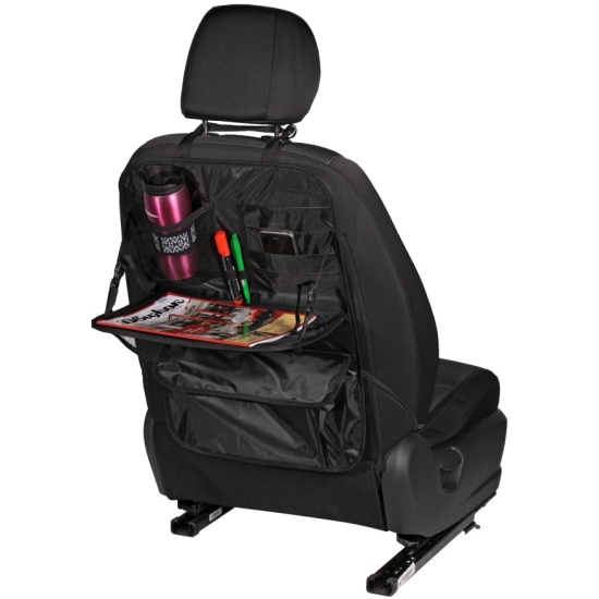 Многофункциональный компактный органайзер на спинку переднего сиденья оснащен удобной системой для хранения предметов различного назначения. На органайзере присутствует «откидной регулируемый столик», отдел для бумаг, карманы для ручек и канцелярских принадлежностей, отделы для гаджетов, а также карманы-подстаканники. Органайзер изготовлен из прочного и легко моющегося материала -100% полиэстера.Преимущества:Защита обивки сиденья от загрязнений;Легко моется;Большой карман для журналов и дорожных карт;Множество карманов для различных мелочей;Откидной регулируемый столик из листового пластика.