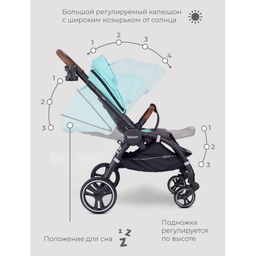 Комфорт для ребенка:можно повернуть лицом к маме/лицом к мируспинка с механической регулировкой раскладывается до горизонтального положения; спальное место очень просторноеподножка регулируетсябольшой капюшон укроет от непогоды и яркого солнышкаколеса с амортизацией - кроха не заметит мелких неровностей на дорогесветоотражающие элементы для безопасностиКомфорт для родителей:вес - 10,3 кг, благодаря облегченной алюминиевой рамебыстрое складывание/раскладывание вместе с блоком, автоматическая фиксация4 положения телескопической ручки - коляска подойдет для любого ростаоткидной бампер - кроху удобно вынуть/посадитьмягкий матрасик можно снять для стиркичехлы из ткани, защищенной от ветра, влаги, выгоранияручка и бампер отделаны практичной экокожейтормоз - “качелька” - не пачкает обувьмакс. нагрузка: 15 кг.макс. нагрузка на корзину: 3 кг.Размеры модели:ширина колёсной базы (см) 59диаметр передних колес (см) 14диаметр задних колёс (см) 23высота от пола до ручки (см) 97/104размер горизонтального положения спинки (в градусах): 170°высота и ширина спинки в см (ДхШ): 50х30глубина (длина) и ширина сидения в см (ДхШ): 25х29размер спального места с поднятой подножкой в см (ДхШ): 90х30