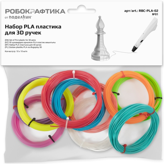 Набор PLA пластика для 3D ручки ПОДЕЛКИН RBC-PLA-02 Робокрафтика, 10 шт. № 01Набор PLA пластика для 3D-ручек, арт. RBC-PLA-02, ТМ "Поделкин", серия "Робокрафтика"Пластиковая проволока является незаменимым расходным материалом для 3D-ручек. Предназначена для создания трехмерных изображений, макетов, моделей, игрушек.Диаметр филамента 1.75 мм, подходит для большинства 3D-ручек на рынке.Набор состоит из 10 разноцветных мотков по 10 метров каждый.Материал изготовления - пластик PLA, нетоксичный и полностью безвредный материал.PLA это биоразлагаемый пластик, который производится из натурального природного сырья - сахарного тростника или кукурузы. Его часто используют в медицине, а также в производстве различной упаковки и тары.Температура плавления PLA пластика - 180 - 200°C. Пластик не причиняет вреда окружающей среде, при нагревании не выделяет токсичных веществ и неприятного запаха.Прочность - средняяВнешний вид поделки - матовый насыщенный.Из PLA пластика получаются красивые поделки, а если они связаны с природой, то очень символично использовать именно этот вид пластика.Внимание! Изделия, нарисованные 3D ручкой из PLA пластика, могут быть недолговечны:1. Пластик относительно хрупкий, и ударив или уронив изделие его легко можно повредить;2. Пластик является натуральным сырьем и приблизительно через 5 лет его структура начинает постепенно разрушатся. Однако, при хранении в комнатных условиях может прослужить более 10 лет.При создании одной поделки хорошо сочетается с другими видами пластика - PETG, ABS.