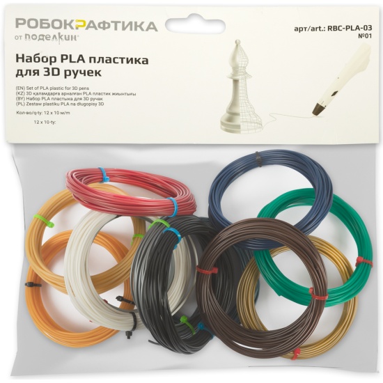Набор PLA пластика для 3D ручки ПОДЕЛКИН RBC-PLA-03 Робокрафтика, 12 шт. № 01Набор PLA пластика для 3D-ручек, арт. RBC-PLA-02, ТМ "Поделкин", серия "Робокрафтика"Пластиковая проволока является незаменимым расходным материалом для 3D-ручек. Предназначена для создания трехмерных изображений, макетов, моделей, игрушек.Диаметр филамента 1.75 мм, подходит для большинства 3D-ручек на рынке.Набор состоит из 12 разноцветных мотков по 10 метров каждый.Материал изготовления - пластик PLA, нетоксичный и полностью безвредный материал.PLA это биоразлагаемый пластик, который производится из натурального природного сырья - сахарного тростника или кукурузы. Его часто используют в медицине, а также в производстве различной упаковки и тары.Температура плавления PLA пластика - 180 - 200°C. Пластик не причиняет вреда окружающей среде, при нагревании не выделяет токсичных веществ и неприятного запаха.Прочность - средняяВнешний вид поделки - матовый насыщенный.Из PLA пластика получаются красивые поделки, а если они связаны с природой, то очень символично использовать именно этот вид пластика.Внимание! Изделия, нарисованные 3D ручкой из PLA пластика, могут быть недолговечны:1. Пластик относительно хрупкий, и ударив или уронив изделие его легко можно повредить;2. Пластик является натуральным сырьем и приблизительно через 5 лет его структура начинает постепенно разрушатся. Однако, при хранении в комнатных условиях может прослужить более 10 лет.При создании одной поделки хорошо сочетается с другими видами пластика - PETG, ABS.