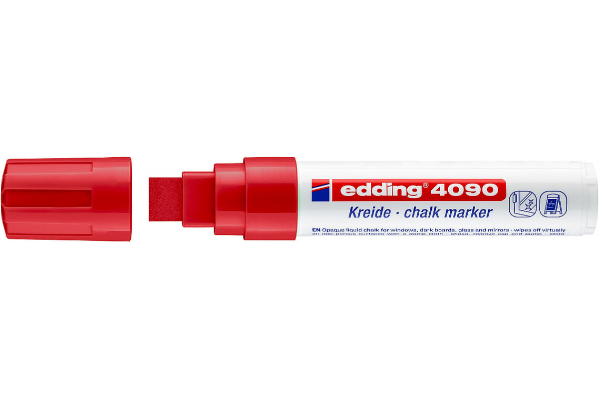 Маркер для окон Edding 4090/2 4-15мм декоративный красный, блистер, 1183387 имеет специальный состав. Инструмент позволяет нанести меловую маркировку без появления пыли.