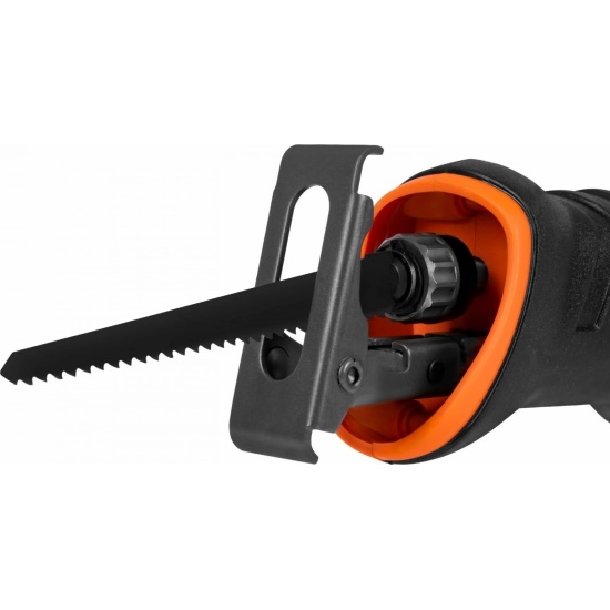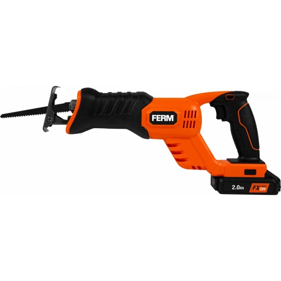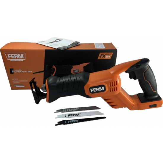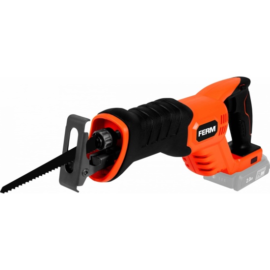 Пила сабельная аккумуляторная FERM RSM1022, без АКБ и ЗУОписаниеАккумуляторная беспроводная сабельная пила FERM RSM1022 используется для распиловки заготовок из древесины, пластмассы и тонколистового металла. Универсальный инструмент, предназначенный для работы на любой строительной площадке, в домашней мастерской или садовом участке. Пила отличается прочной и надежной конструкцией, выполнена из высококачественного пластика, имеет компактный эргономичный дизайн. Сабельная пила обладает высокой мощностью и производительностью. Скорость без нагрузки с максимальным числом оборотов холостого хода 3000 об/мин. Длина хода 23 мм. Максимальная режущая способность: по дереву – 115 мм, по металлу – 10 мм. В комплект инструмента входит 3 высокопрочных лезвия: по дереву, по металлу и универсальное. Замена пильного диска осуществляется легко и быстро, благодаря быстрозажимному патрону, без использования дополнительных инструментов. У инструмента регулируемая опорная подошва, что позволяет обходить препятствия и контролировать процесс распиловки. Для более безопасной эксплуатации сабельная пила имеет предохранитель от случайного запуска. Рукоять и корпус инструмента оснащены прорезиненными вставками, которые отвечают за плотную фиксацию инструмента в руке. Сабельная пила работает от аккумуляторной батареи, что позволяет свободно работать в любом удобном для вас месте. Инструмент упакован в картонную коробку. В комплект входит сабельная пила, 3 лезвия и инструкция. Аккумуляторная батарея и зарядное устройство не входят в комплект и приобретаются отдельно.Беспроводная аккумуляторная сабельная пилаСкорость без нагрузки 0-3000 об/минДлина хода 23 мм3 лезвия в комплекте: по дереву, по металлу и универсальноеРегулируемая опорная подошваПредохранитель от случайного запускаРучки и корпус с прорезиненными вставками для надежного хватаАккумуляторная батарея и зарядное устройство в комплект не входят