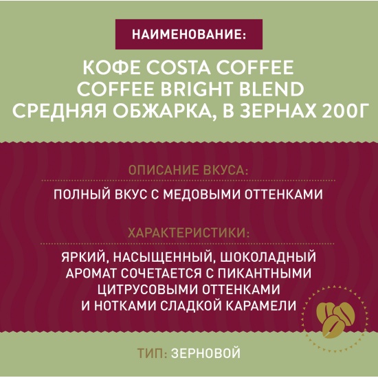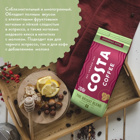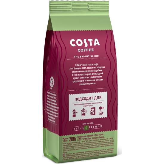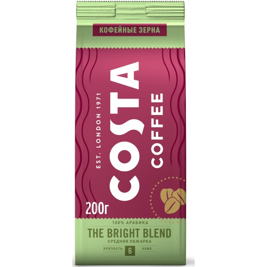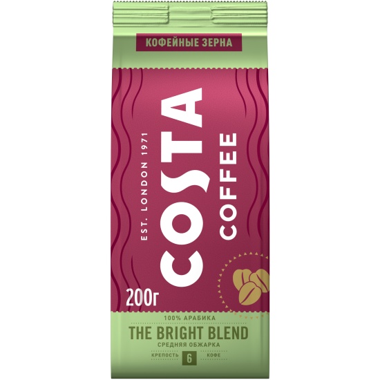 Кофе в зернах Costa Coffee Bright Blend, средняя обжарка, 200г. 5012547001643