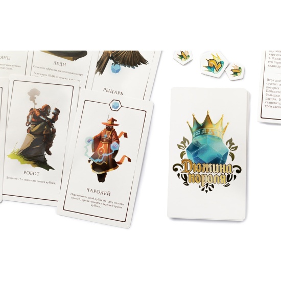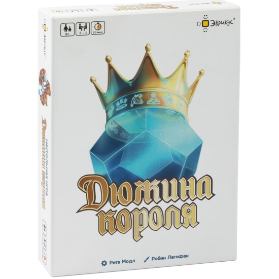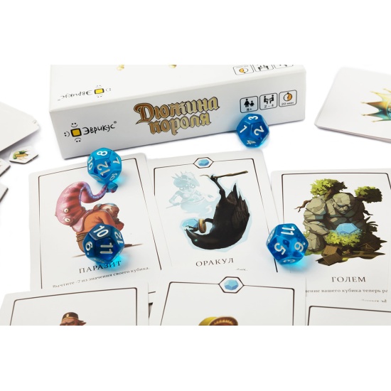Настольная игра ЭВРИКУС Дюжина короляДвенадцать королевств нуждаются в вас! Используй мощь камней и силу союзников, объедините королевства под своим знаменем. Для победы вам понадобится тактика, невозмутимость и немного удачи. Помните, победителем останется только один. «Дюжина короля» – это тактическая настольная игра, в которой вам предстоит предугадывать действия соперников в борьбе за наибольшее значение вашего кубика. Каждый ход игроки разыгрывают 1 из своих карт, меняющих значение кубиков игроков на столе. Для победы в игре необходимо стать победителем в 2 раундах.Кому подойдёт эта игра?Тому, кто хочет занять трон Двенадцати королевствДля молодёжи и весёлой компанииПоклонникам тактических игр с элементом удачиЛюбителям фэнтазиКак играть?Игроки ходят одновременно и совершают определённую последовательность действий каждый раунд:1. В начале раунда игрок бросает кубик и кладёт его перед собой таким образом, чтобы остальные игроки могли видеть его значение.2. В течение раунда каждый игрок выбирает по одной карте и выкладывает её перед собой лицом вниз. Затем все карты переворачиваются. Если карта игрока не совпала с картой других игроков, он может применить её эффект. Карта позволяет изменить значение кубика или условия победы в текущем ходу. Если игроки выложили одинаковые карты, они отменяют друг друга и игроки не смогут применить их эффекты.5. Игрок с наибольшим значением кубика побеждает в ходу и получает победные очки. Затем игроки вновь выбирают карту с руки и выкладывают её на стол лицом вниз.Раунд заканчивается, когда у одного из игроков осталась одна карта на руке или один из игроков набрал 8 очков. В таком случае игроки забирают сброшенные карты обратно на руку и начинают новый раунд.Игра заканчивается, когда один из игроков победит в двух раундах. В таком случае он становится новым правителем Двенадцати королевств!