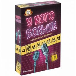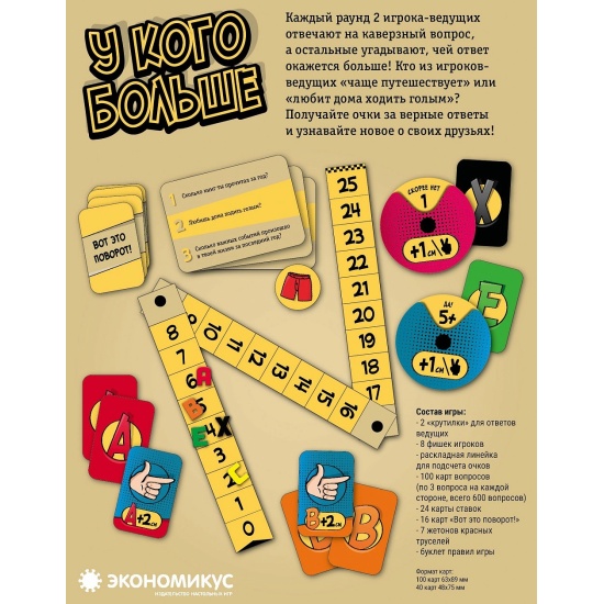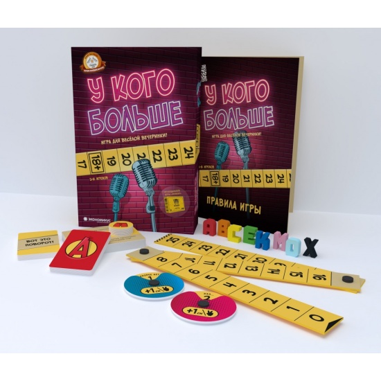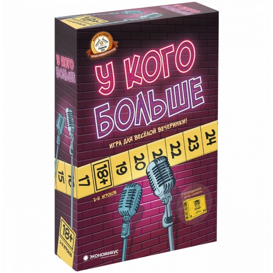 Настольная игра ЭКОНОМИКУС У кого больше 18+Каждый раунд 2 игрока-ведущих отвечают на каверзный вопрос, а остальные угадывают, чей ответ окажется больше! Кто из игроков-ведущих «чаще путешествует» или «любит дома ходить голым»? Получайте очки за верные ответы и узнавайте новое о своих друзьях!В коробке 600 интересных вопросов, на каждой карте вопросы из 3-х категорий: мирно-повседневные, молодежно-провокационные и философски-дискуссионные — выбирайте любые на свой вкус!