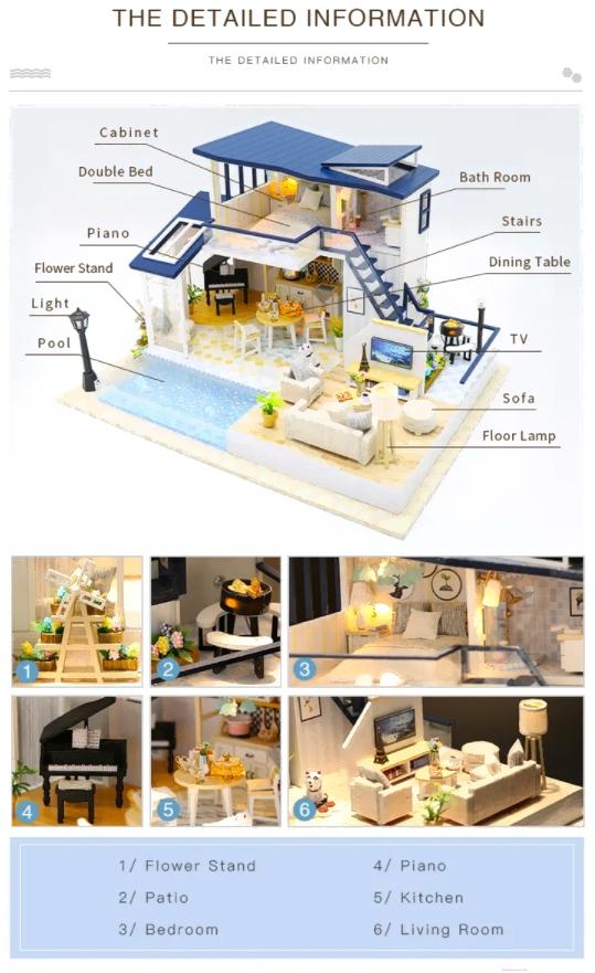• Комплектация кукольного домика/румбокса кровать, обеденный стол, письменный стол, стул (3 шт.), кресло, унитаз, торшер, телевизор, диван, тумба, умывальник, люстра, пианино, журнальный столик, душевая кабина, декоративный цветок (2 шт.), пуфик, кухня, полка, светильник, мангал, лампа, раковина, посуда, духовка, лестница, подушка (6 шт.), фонарь (2 шт.), животное (собачка), еда/напитки, аксессуар для животных, одеяло, ящик (6 шт.), столовые приборы