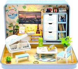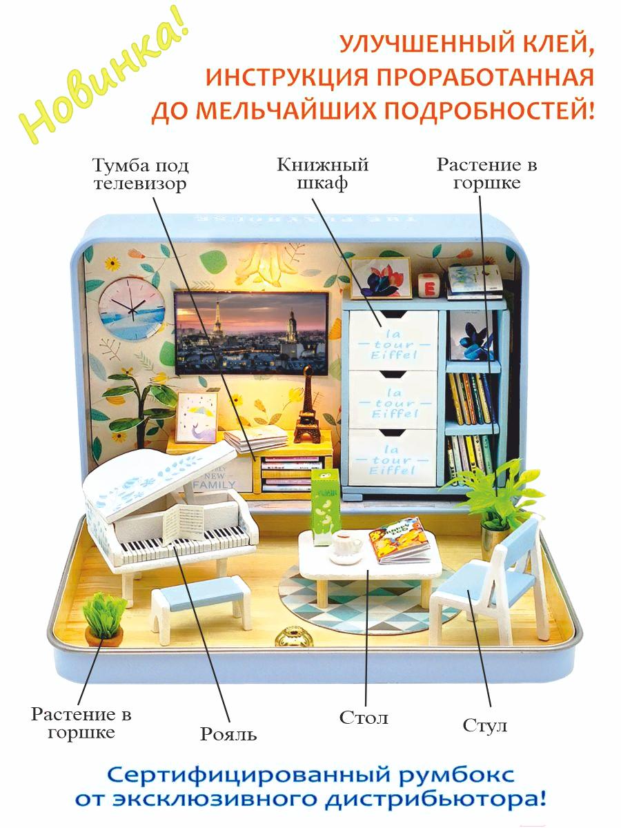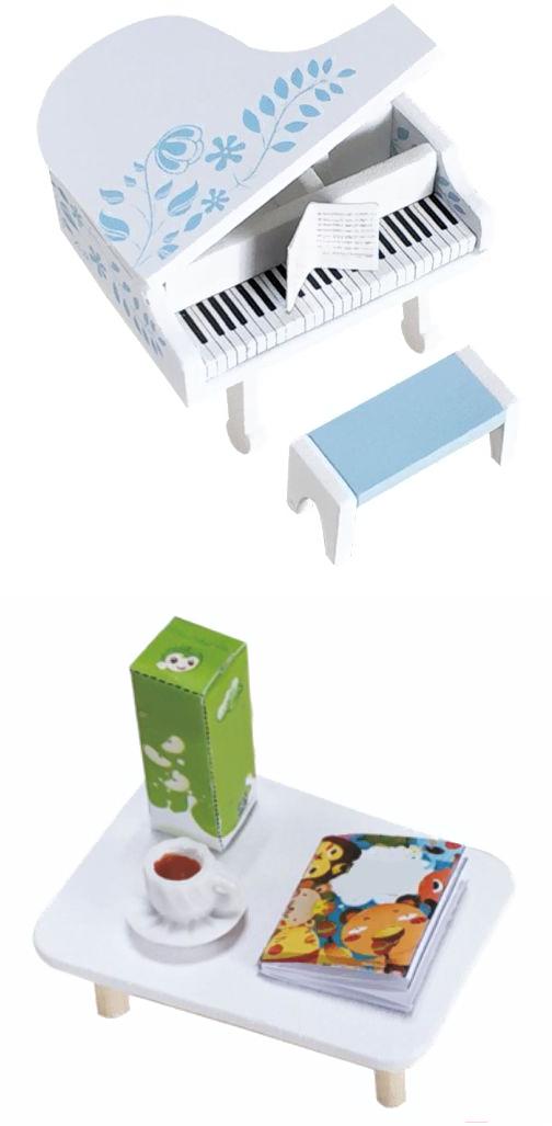 • Комплектация кукольного домика/румбокса стул (2 шт), шкаф, игрушка для детской, часы, декоративный цветок (3 шт), рояль, картина (4 шт), книга (21 шт), стол, статуэтка (2 шт), еда/напитки (2 шт)