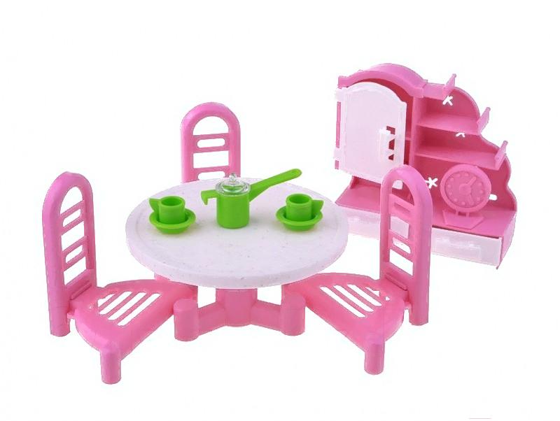 - Вид аксессуара стул (3 шт.), посуда (4 шт.), шкаф (сервант с полочками и ящиками), часы, стол