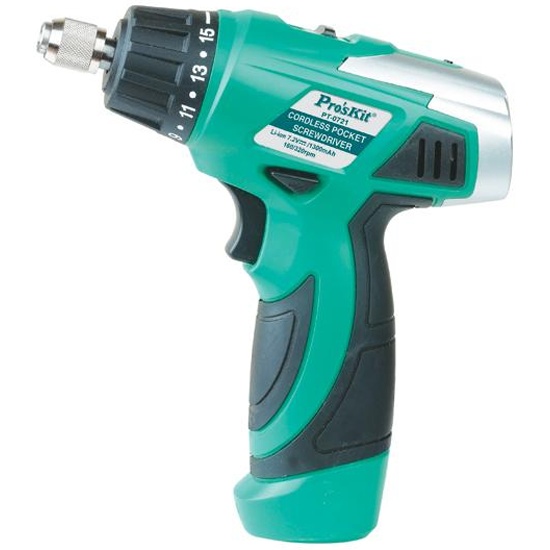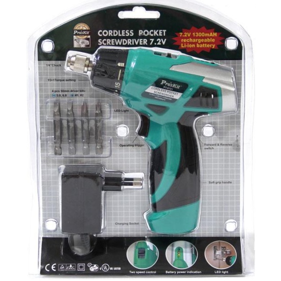 Шуруповерт аккумуляторный Pro'sKit PT-0721F, Две скорости : 0-200 об/мин / 0-400 об/мин, питание 7,2В/1,3Ач, Li-Ion, Максимальный выходной крутящий мо Proskit PT-0721F