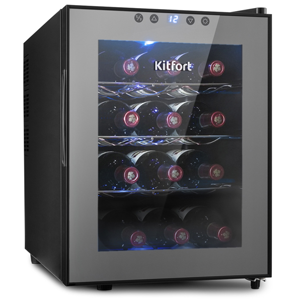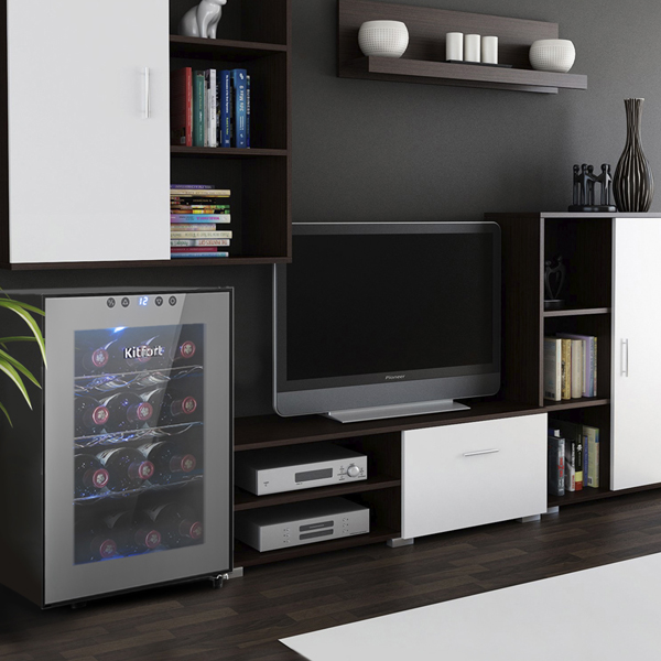 ОсобенностиДверца шкафа из тонированного стекла не пропускает УФ-излучение, что исключает вероятность окисления вина, в верхней её части расположена сенсорная панель управления со светодиодным дисплеем.